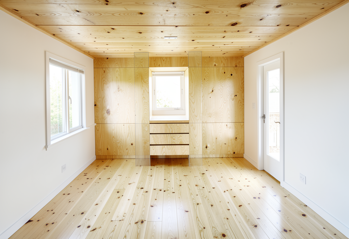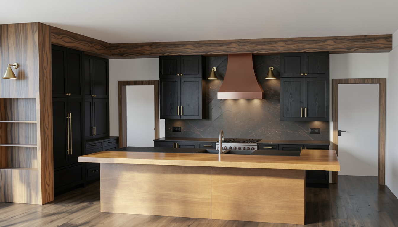 photorealistic render of a custom kitchen interior maintain original design and colors exactly do not alter color palette perimeter cabinetry is dark stained wood almost black with visible natural wood grain and a soft satin finish not painted not flat cabinet hardware is brushed brass handles and knobs kitchen island is a warm medium caramel stained wood with visible grain and a satin finish island and perimeter countertops match exactly in material and color range hood is brushed antique copper with a soft aged patina not polished not shiny wall sconces on either side of the hood are brass with a warm brushed finish lighting is warm 2700k 3000k a continuous wood soffit architectural band runs along the top of the cabinetry in an antique wood tone with subtle aging doorways are pocket doors with trim that matches the surrounding wood tones use realistic natural lighting soft shadows and accurate material reflections emphasize wood grain texture and depth and subtle metal reflectivity avoid overexposure avoid high gloss finishes and do not change or reinterpret any colors there are no seams in the island and the doors are pocket doors remove the handles on the pockets doors