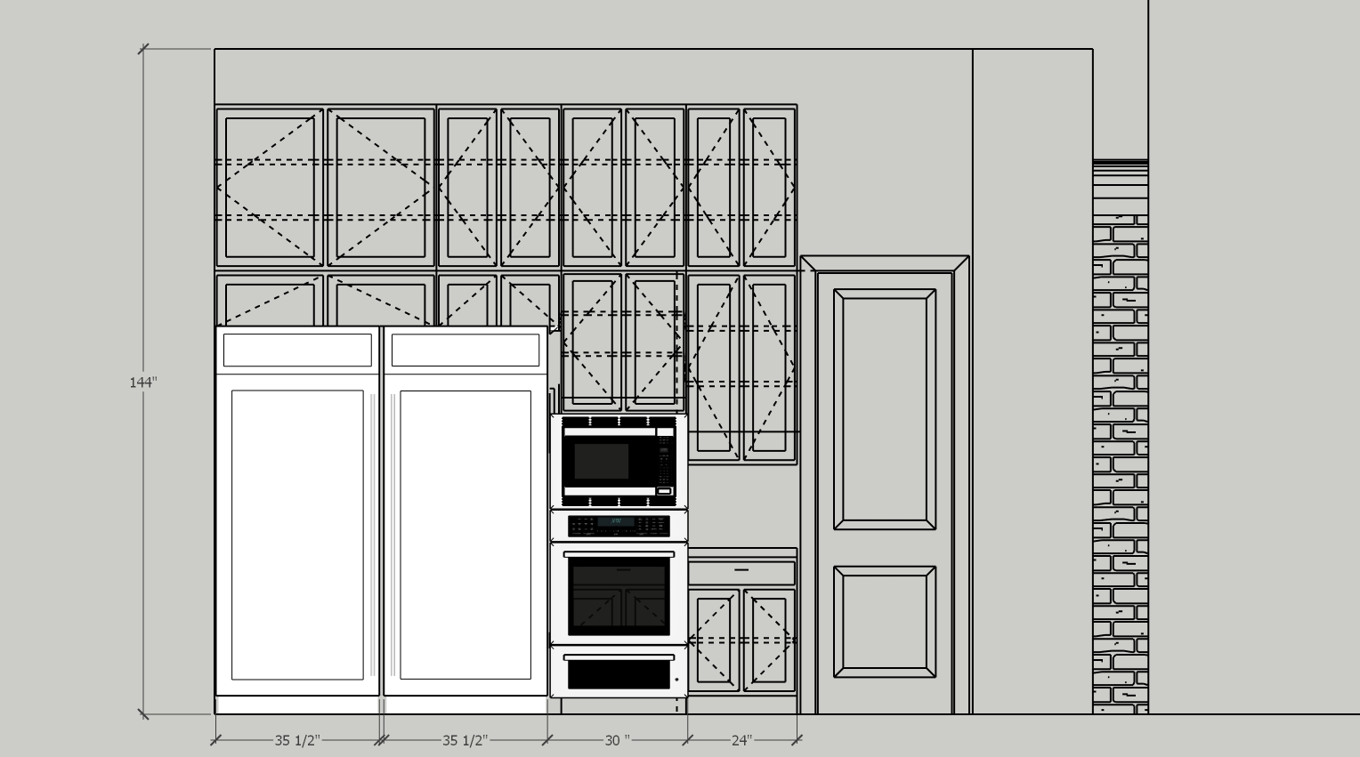 render this kitchen elevation to scale the sub zero units are each 36wx84 tall and reset the cabinets above all the appliaces to look high end