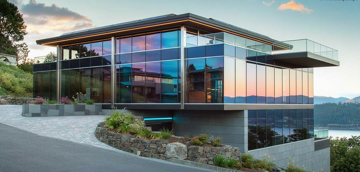 residential building on a steep site with a large window wall entrance