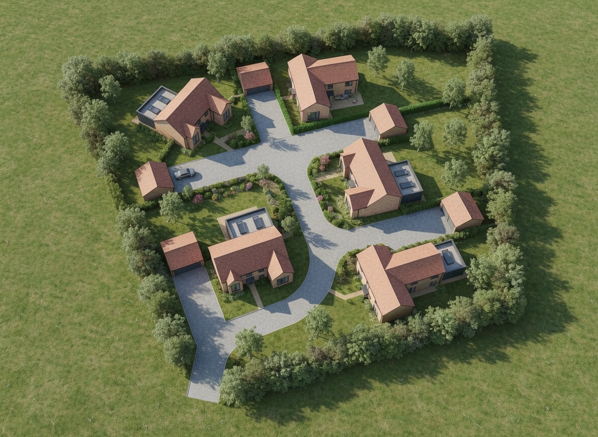 preserve the existing geometry and the existing context exactly as provided do not modify alter reinterpret simplify add remove scale stretch rotate or reshape any geometry do not change building massing floor count facade composition balconies windows structural grid or proportions do not change the site surroundings street layout neighboring buildings vegetation or context elements or road marks apply only material lighting and atmospheric refinement facade materials light beige warm grey concrete and plaster subtle texture high material realism emphasize facade depth through existing balconies and window recesses using light and shadow only warm interior lighting visible through windows soft and natural neutral exterior lighting early evening blue hour atmosphere soft sky realistic light falloff photorealistic architectural rendering clean and balanced contrast calm cinematic mood style contemporary european residential architecture minimalist premium understated