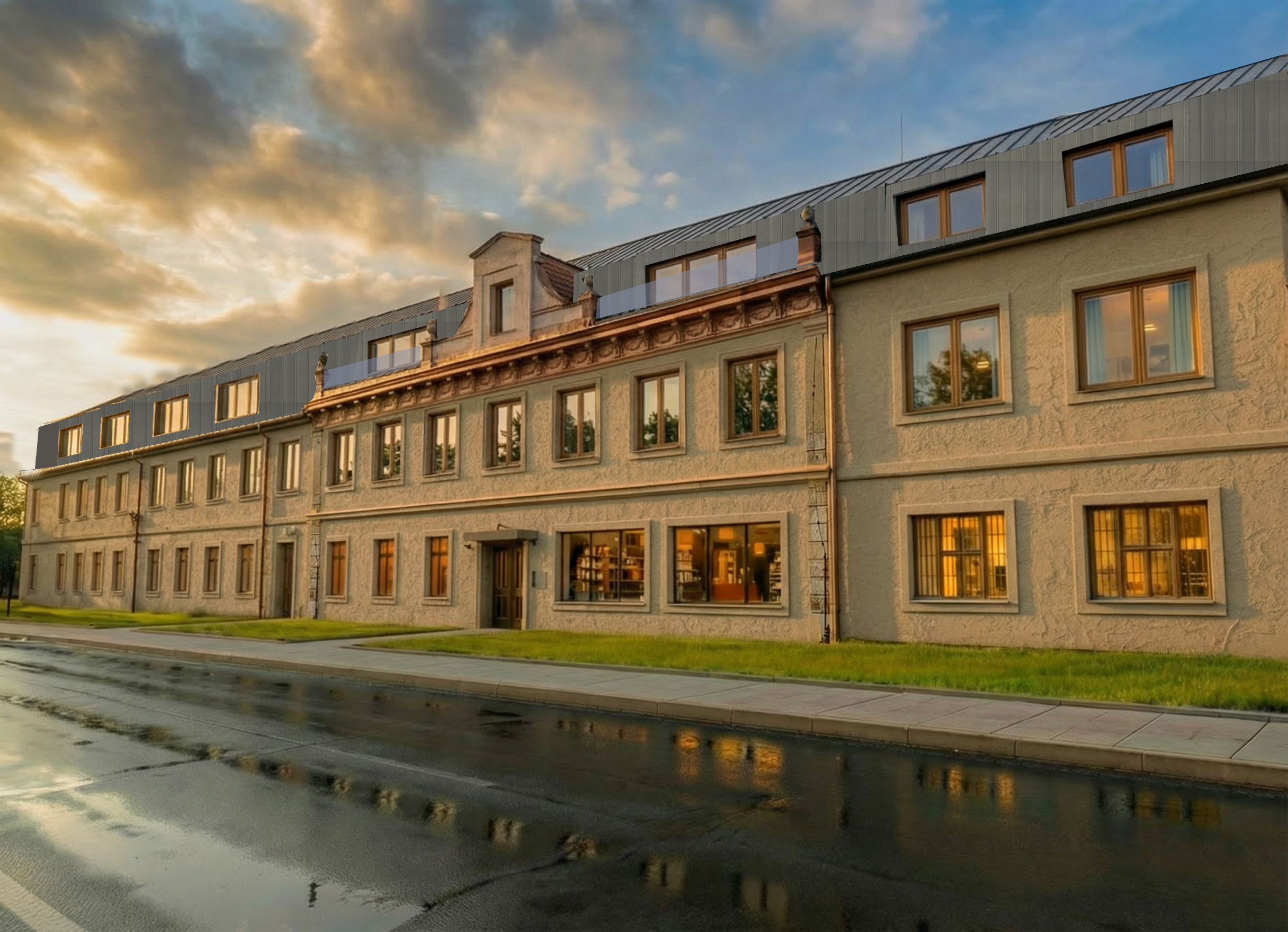 black rheinzink roof wooden windows light up intertiors summer midday wet road few shrubs by facade capuccino plaster facade keep glass railing in roof