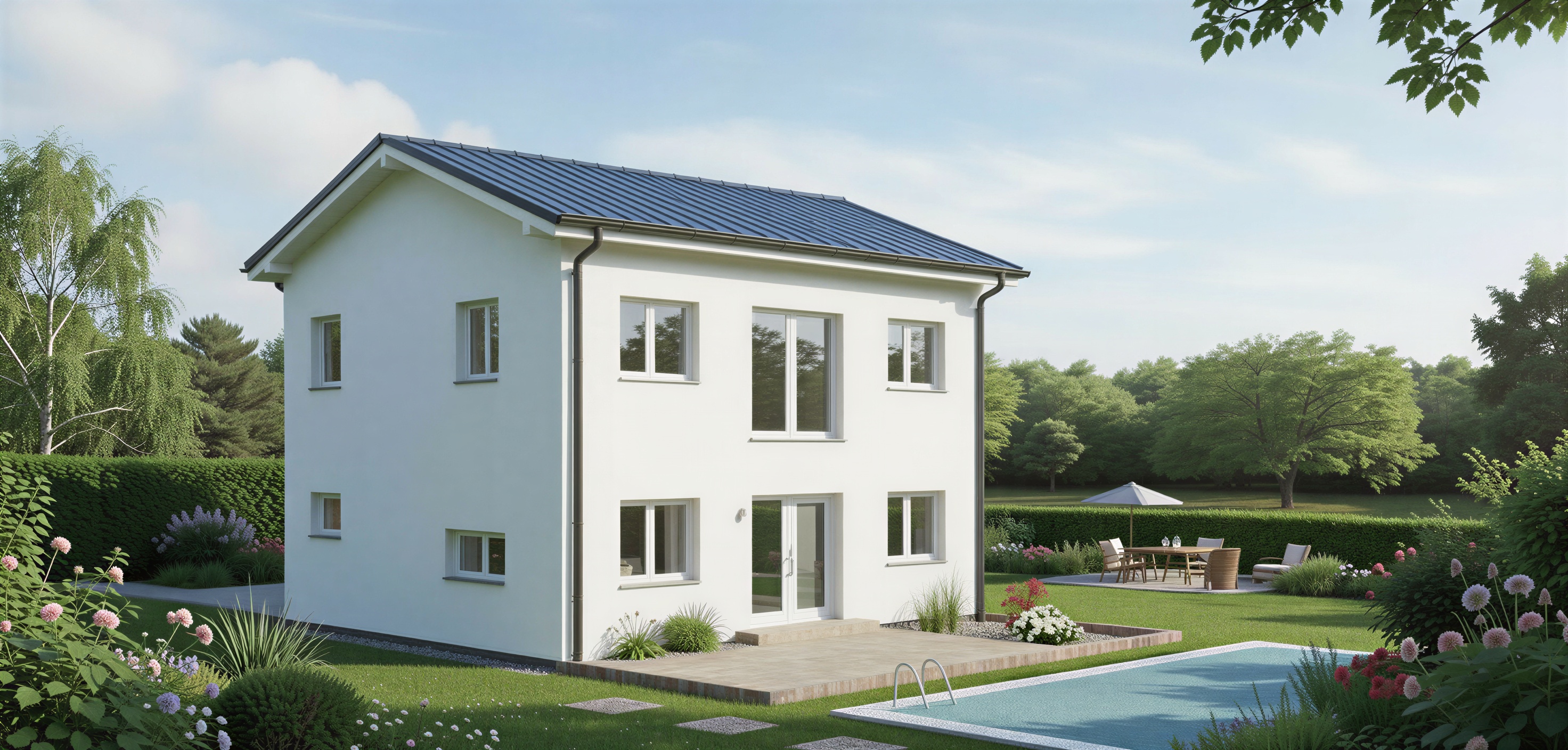 bitte stelle dieses haus mit neuen anthrazit f rbigen dachziegeln dar und den pool vor der terrasse in realistischer optik