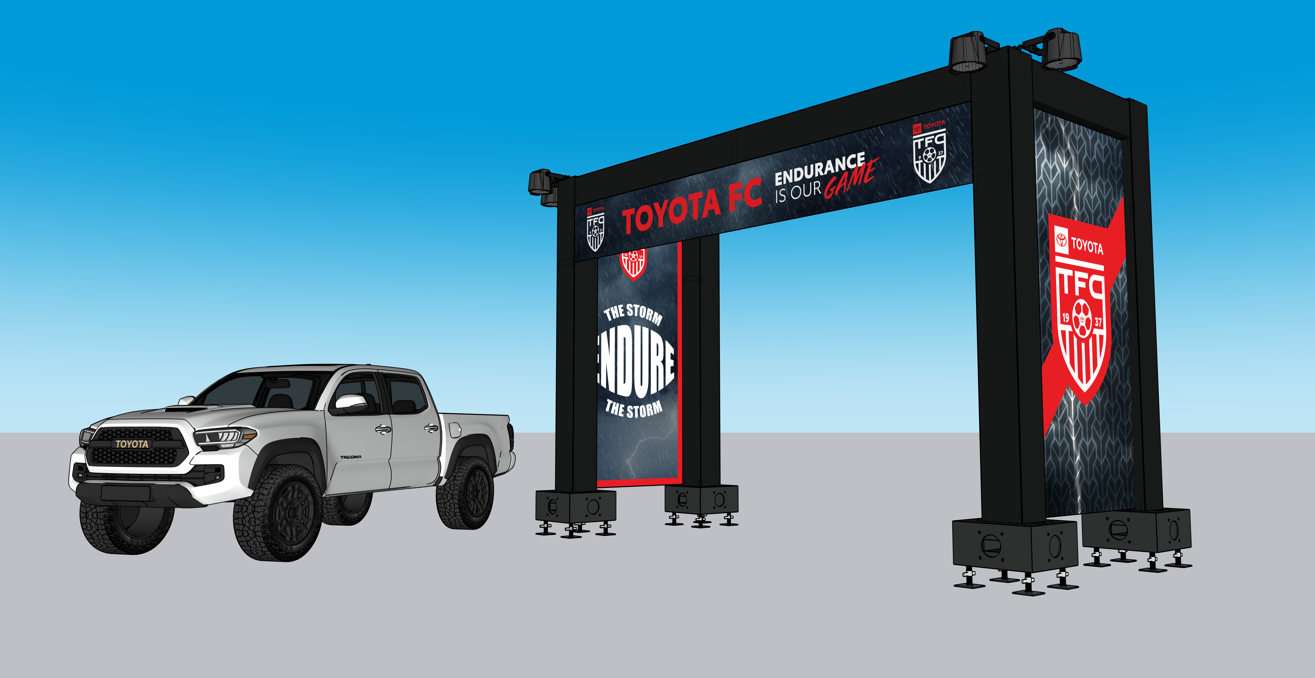 car parked next to a large modern archway the archway is sleek and black with intricate patterns and vibrant red signage for a football club the car is a rugged bright white color exuding strength and resilience set on a gray surface a stormy sky fills the backdrop casting soft shadows the atmosphere is dynamic and sporty with a sense of anticipation and energy place this in wynwood by shipping containers and make the gound a parking lot make the shipping continers black and put the toyota logs on the containers