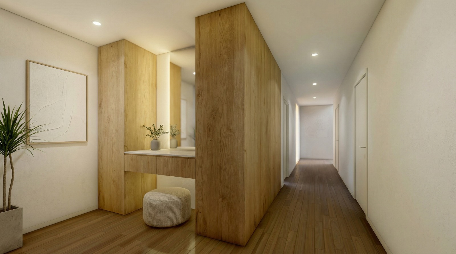 editar a imagem mantendo exatamente o mesmo enquadramento perspetiva e composi o do trio corredor transformar o render numa fotografia de arquitetura de interiores com imagens realistas substituir ajustar os materiais para que o pavimento e o arm rio pain is tenham madeira muito semelhante e coerente ambos em nogueira natural tom e veio parecidos acabamento mate satinado suave textura pbr poros e varia es subtis naturais ajustar o banco pufe por baixo do m vel trocar para tecido bege bonito e premium ex linho tecido entran ado com textura vis vel costuras discretas e sombras de contacto realistas no ch o adicionar no m vel de entrada uma pequena planta em vaso cer mico simples folhagem verde natural e um livro discreto de capa minimalista bem posicionados escala correta com sombras e reflexos realistas melhorar a ilumina o focos embutidos no teto com luz realista temperatura quente neutra aprox 3000k queda de luz natural reflexos suaves global illumination cred vel sem glow artificial acrescentar micro detalhes fotogr ficos ligeiras imperfei es varia o subtil de tons oclus o ambiente realista mantendo paredes brancas limpas e portas iguais resultado final foto interior minimalista n tida natural sem aspeto 3d cgi