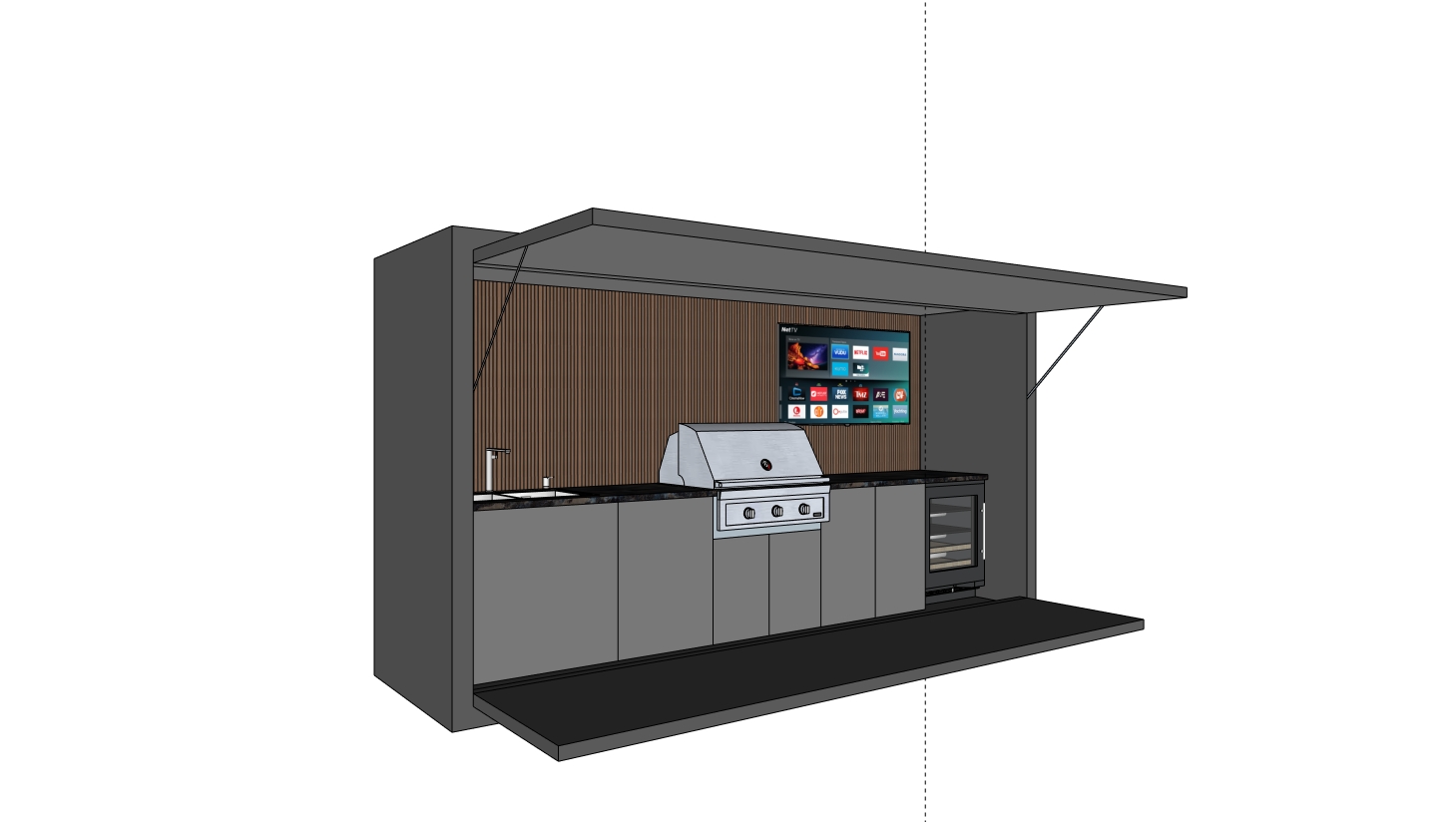 render this outdoor kitchen bbq area in a paved back yard during summer