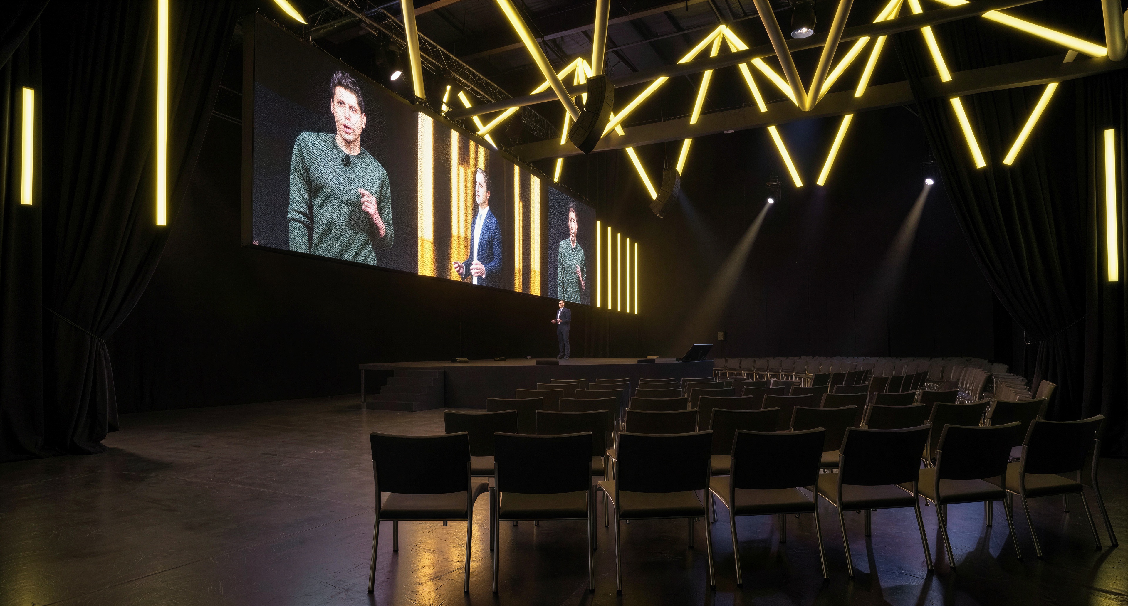 a dark immersive stage environment with an oversized suspended led screens black drapes to perimeter add business people in smart casual work clothing in the audience