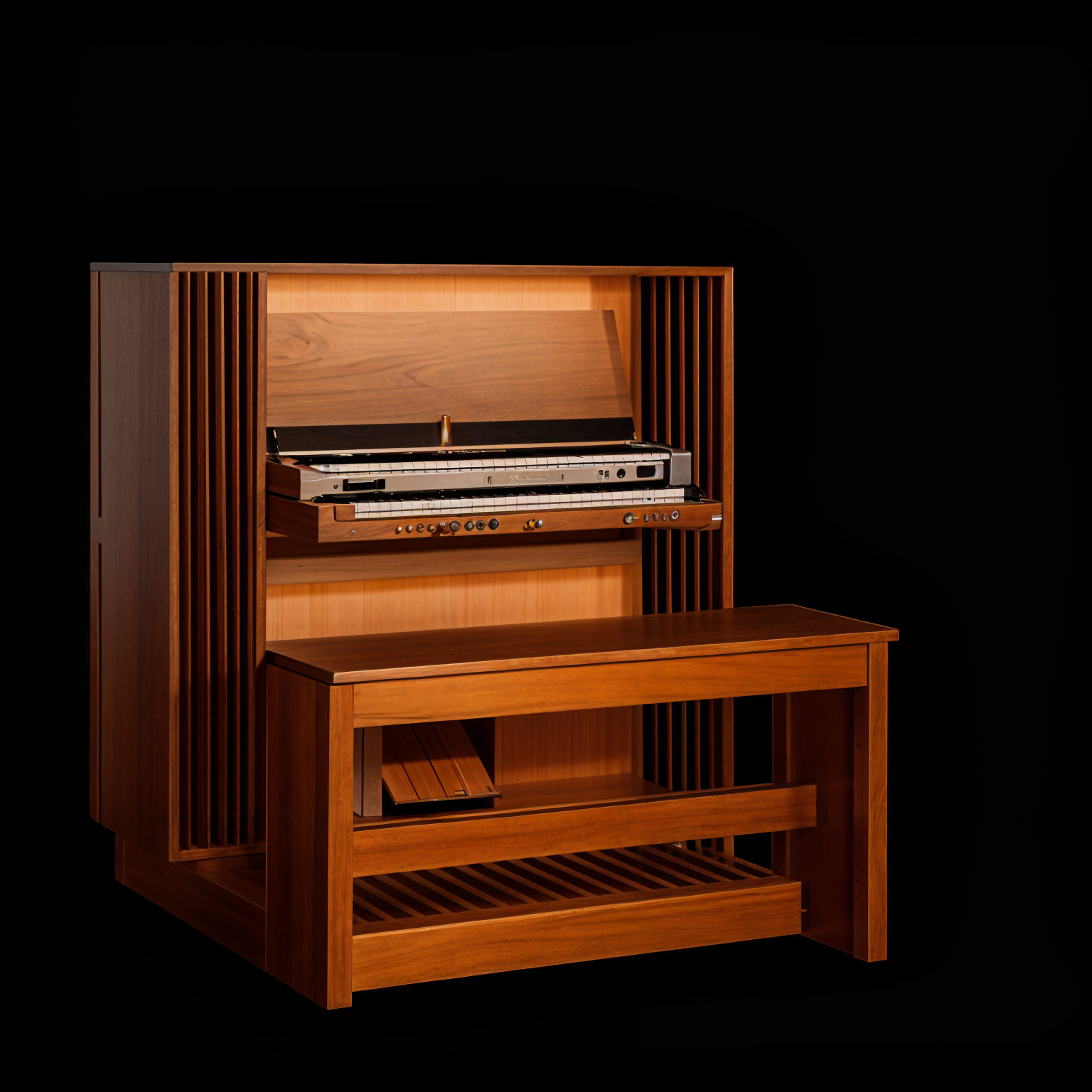 update organ console pedals and bench to glossy black update both keyboards 1 and 2 only white keys of organ console to oak