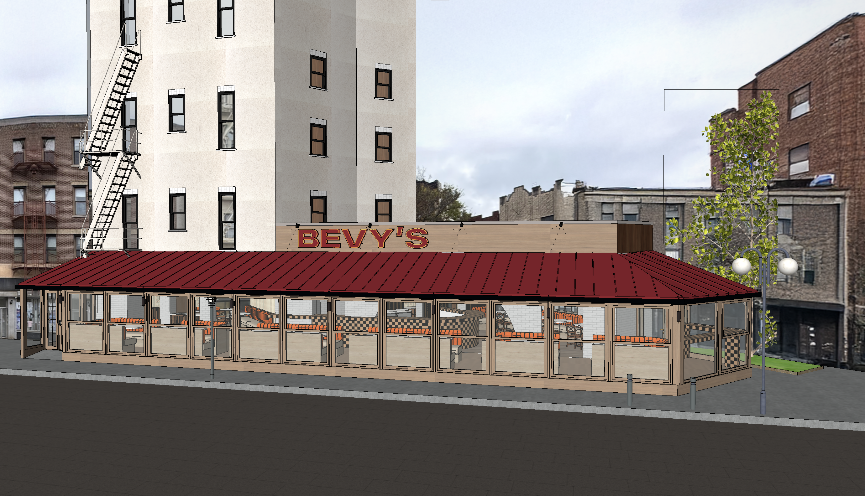 photorealistic summer daytime exterior of the bevy s caf in new york with a long glass enclosed terrace framed in light oak wood light oak parapet and light oak upper fa ade sign panel deep burgundy standing seam roof in bright sunlight strong daylight reflections on the glazing warm visible interior with orange velvet banquettes black fa ade spotlights above the bevy s burgundy sign with subtle orange neon outline clean sidewalks green summer trees and a vibrant sunlit new york streetscape with brick buildings and crisp shadows