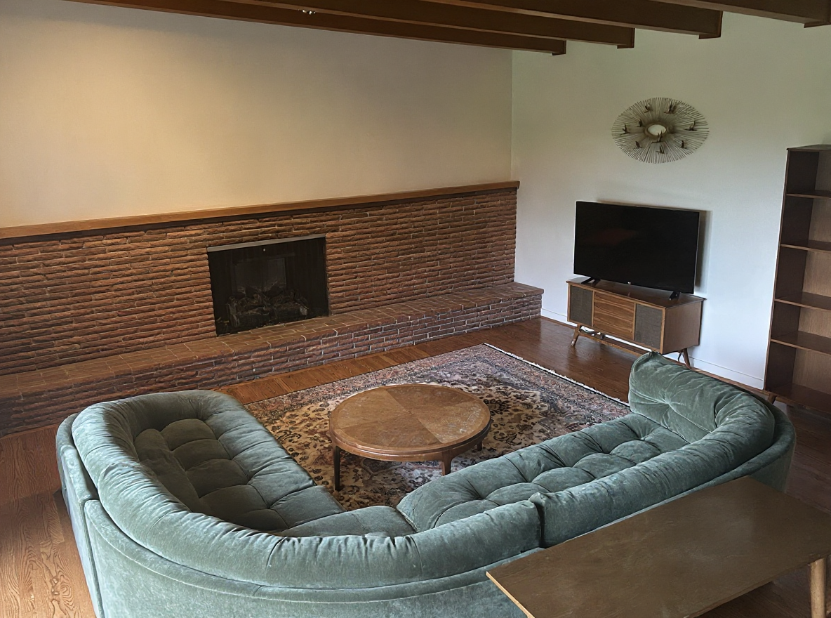 remove the couch tv and tv stand bookshelf and coffee table render a blank room to use as a before image leave the fireplace wall untouched