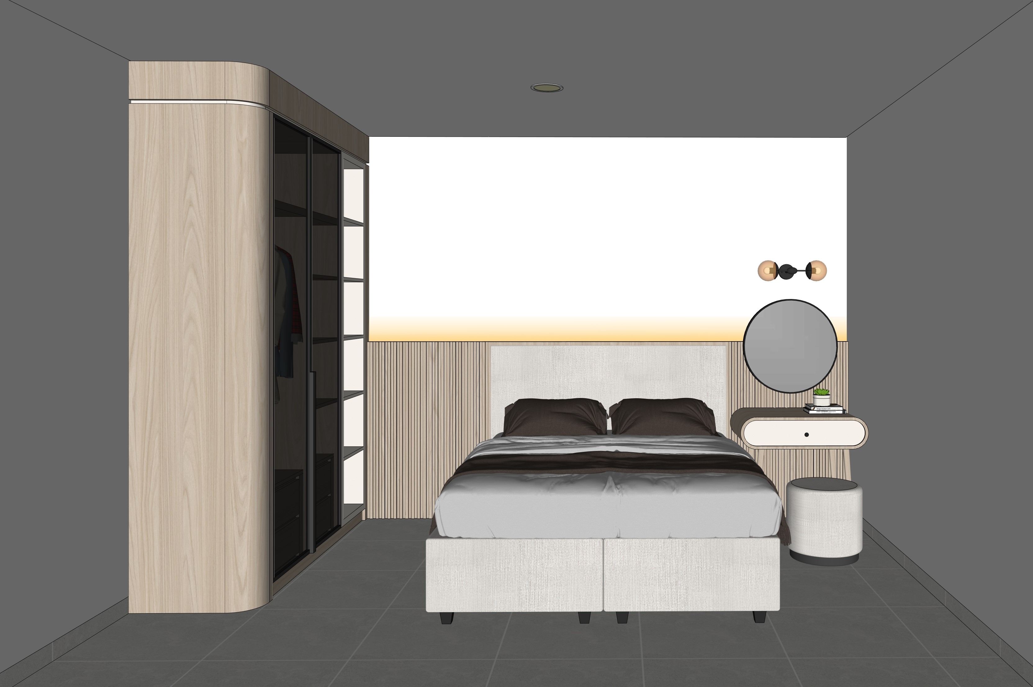 render a luxury modern bedroom interior based strictly on the provided reference design without changing the layout proportions or furniture design floor finished with soft light grey marble matte texture smooth and elegant ceiling in pure white matte clean and minimal with soft lighting walls finished in soft white matte creating a calm and refined atmosphere bedhead design with mixed materials vertical natural wood slatted panels on the sides and lower area combined with a padded fabric panel behind the bed upholstered in premium soft neutral fabric featuring a hidden warm white led strip for soft indirect ambient lighting on the right side of the bed a modern vanity table with elegant finishes paired with a round mirror with black matte frame and a wall mounted light above the mirror turned on emitting warm light on the left side a wardrobe with black tinted glass doors and black matte frames creating a sleek and luxurious look the wardrobe interior is subtly visible through the tinted glass with warm led lighting inside each shelf all lights turned on an adjacent open shelving unit with matching finishes equipped with warm led lighting on every shelf fully illuminated lighting concept combines ambient lighting indirect led lighting and accent lighting creating a cozy warm and high end atmosphere high end photorealistic render realistic materials soft shadows global illumination cinematic lighting warm color tone luxury modern bedroom ultra detailed 4k quality