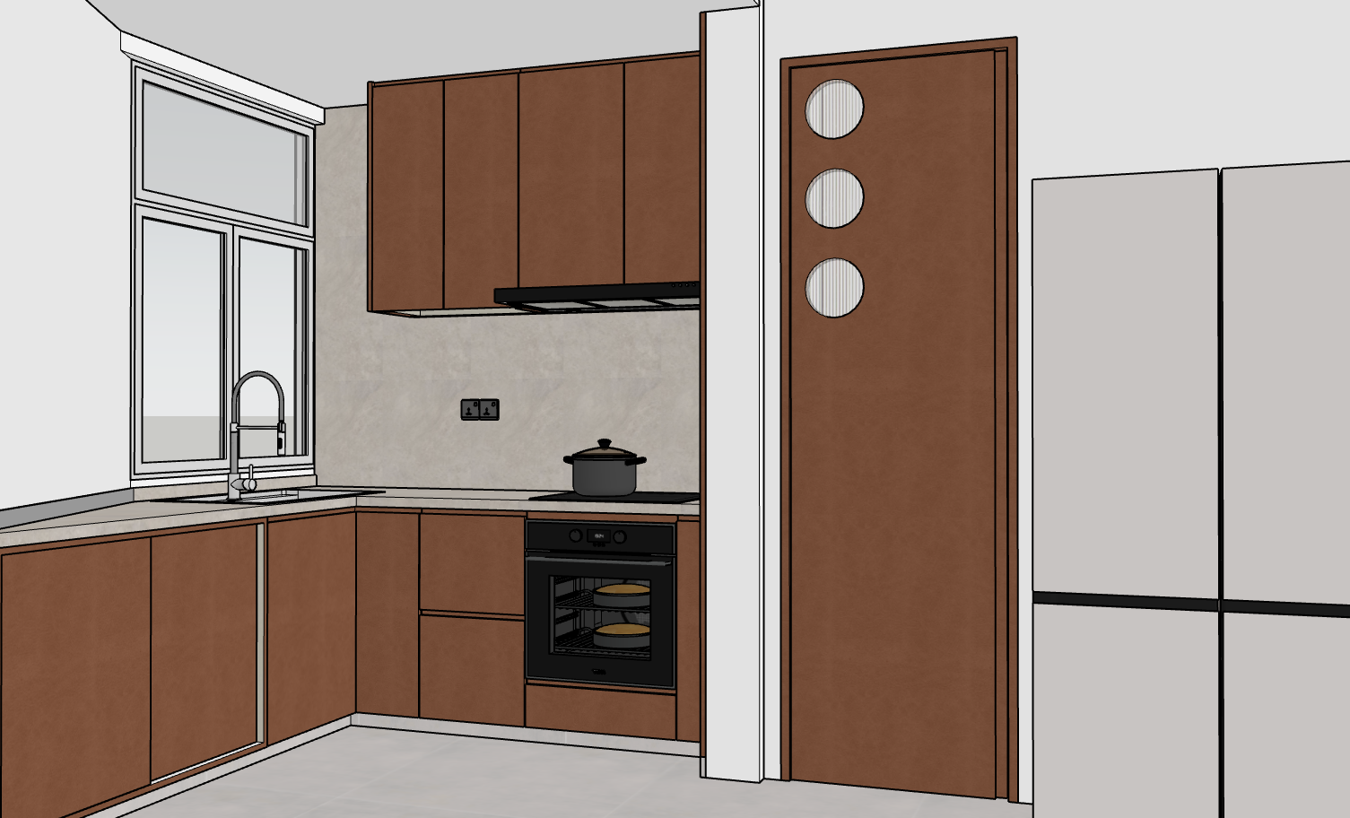 brown leather carpentry led strip light below cabinet matt light grey stone looking counter top and backsplash matt grey floor tiles round recessed spotlights on ceiling