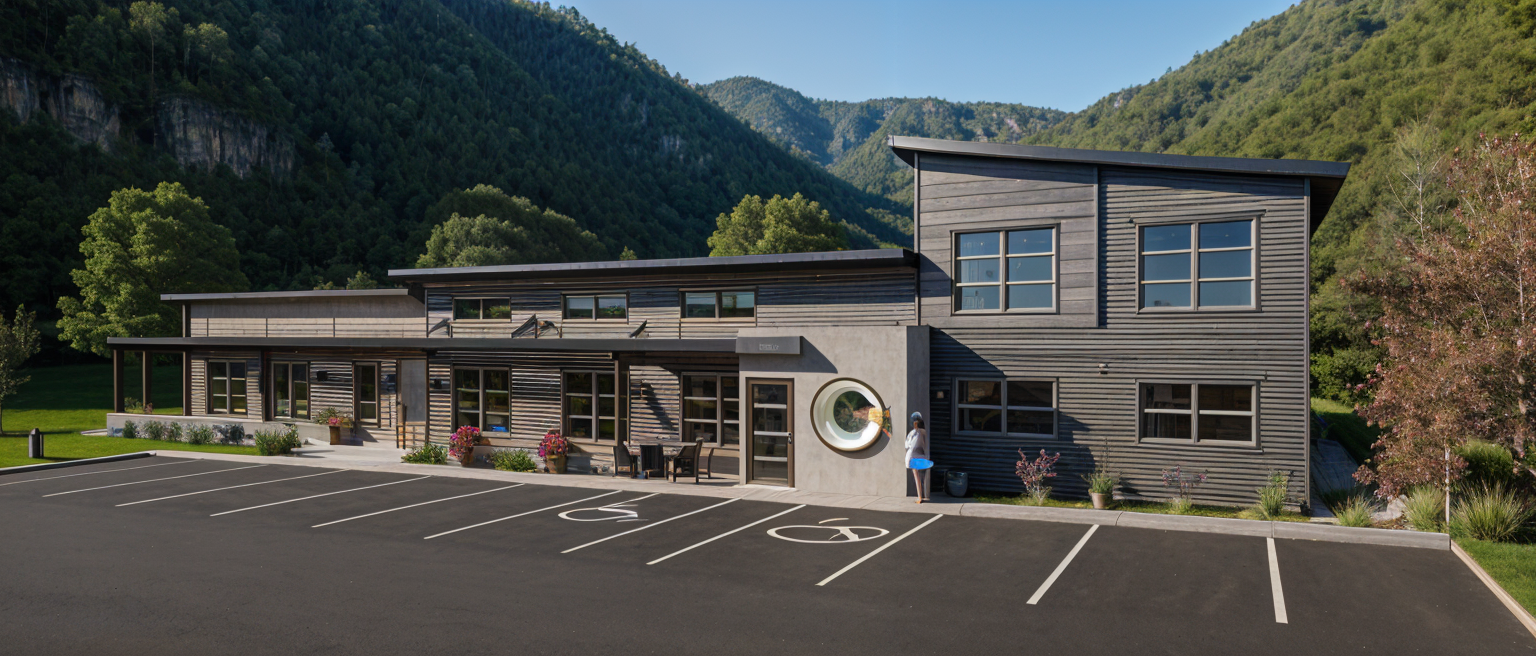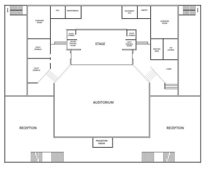 modernist exterior shot make this 2d plan 3d only one storey building facade has perforated panels and commercial look like architecture