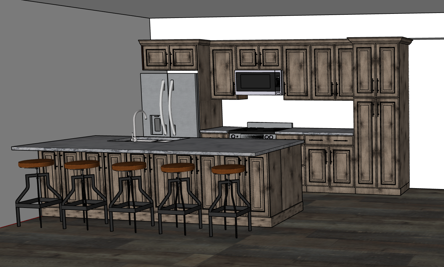 this is a beautiful kitchen with cabinets made of knotty alder stained with a grey wash stain and an onyx glaze the handles are all a matt black all appliances are a modern stainless steel the countertops are a beautiful white marble the flooring is a nice modern medium light rustic lvp flooring this kitchen has lots of natural light coming in from behind the camera the cabinets go up to a soffit in the ceiling that drops down about 14in and extends off the wall about 15in the island butts right into the wall on the left
