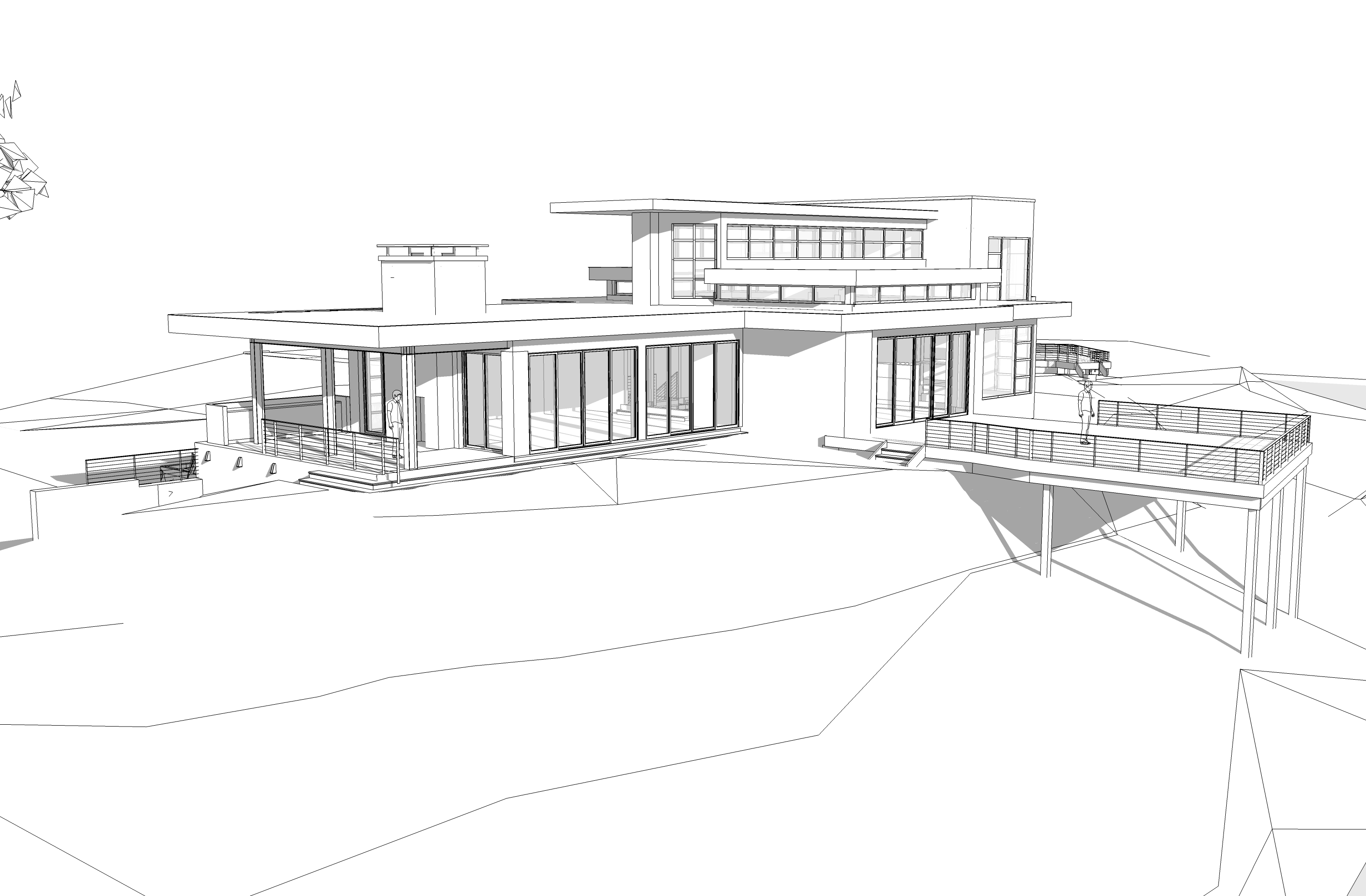 aerial view industrial home design matte wood vertical siding matte black panel accent walls lake in foreground trees in background