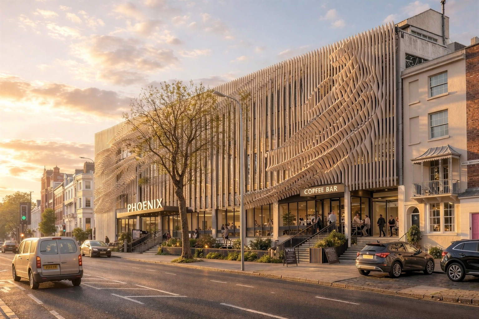 without changing the pattern and overall sculptural formwork can you add more realism and quality to this visual keeping the phoenix coffee signage intact