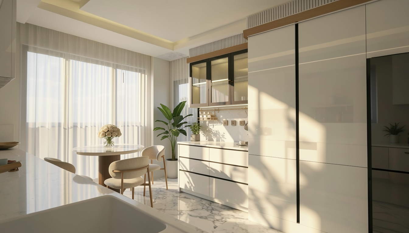 create a hyper realistic render of this kitchen remodel change the cabinetry to light wood with polished brass knobs hide the microwave and oven and change the kitchen for a la cornue blue stove change the backsplash and kitchen island for calcutta viola and change the floor for a checkered green and white marble change the recessed light for warm light and use matilda goads flora brass lamp in celadon for the pendants above the kitchen island add a tropical orchid arrangement