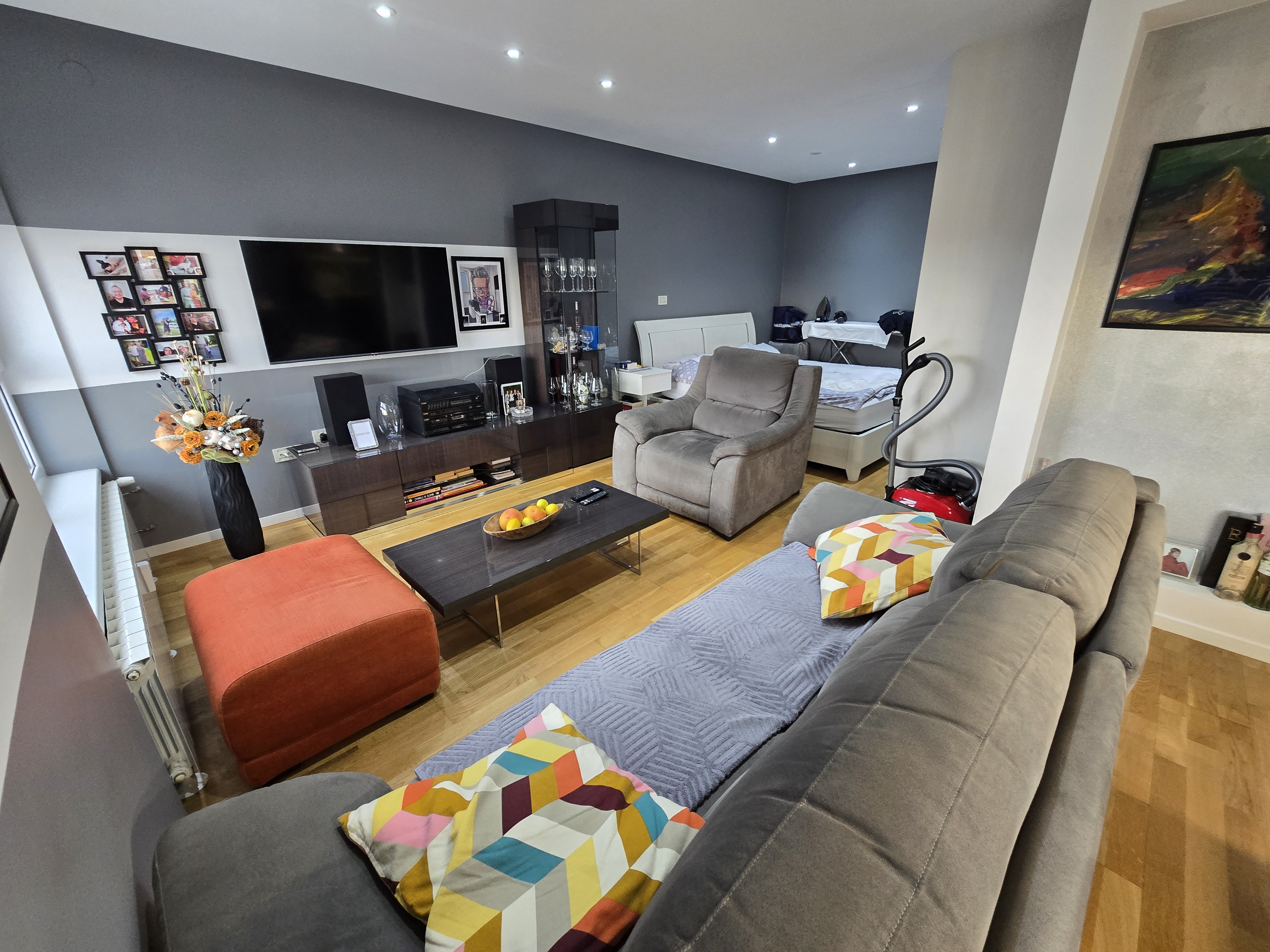 swap the seats of the sofa and the red stool remove the bed leave the floor plan and appearance of the room the same as it is leave the perspective and camera angle the same