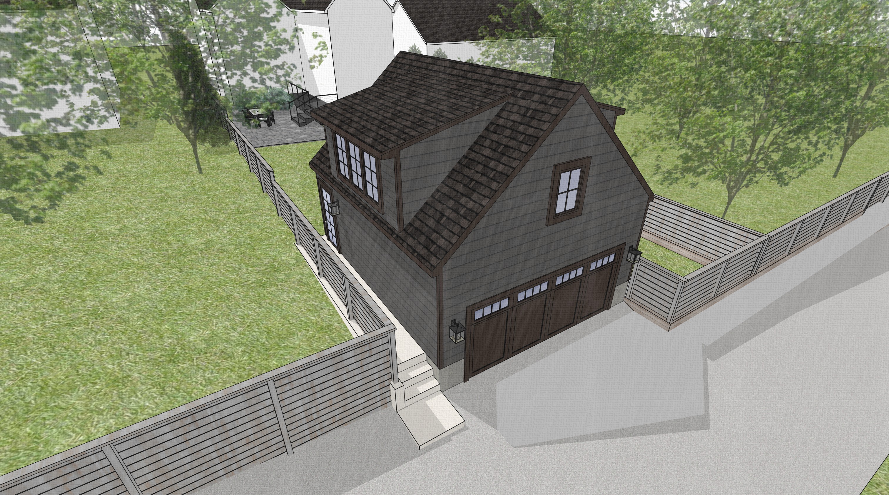 realistic dark gray taupe siding with dark brown trim light wooden fence full green landscaping