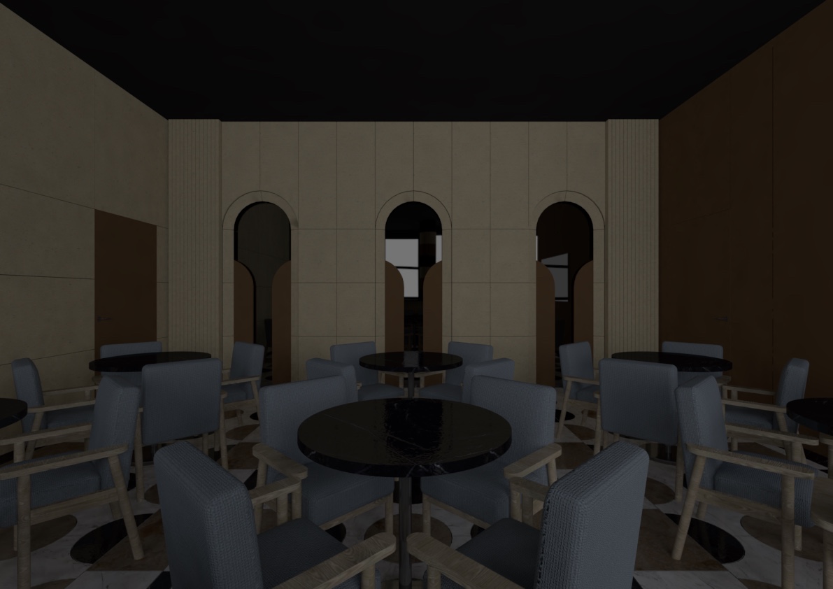 enhance the realism materials and architectural lighting of this restaurant interior render without changing any geometry proportions layout or architectural elements the camera perspective furniture placement doors niches flooring pattern tables chairs and architectural composition must remain exactly as in the original render do not modify the stereotomy panel joints alignment module dimensions or spacing of any wall panels wall materials wall nr 1 front wall and wall nr 2 left wall are clad in beige modular 3d printed panels preserve the panel stereotomy while enhancing material realism with subtle matte texture faint layering characteristics and gentle tactile detail typical of high quality 3d printed filament keep the beige tone refined elegant and consistent wall nr 3 right wall is clad in orange modular 3d printed panels preserve panel layout and joints while refining the surface with soft matte reflections and subtle texture for realism doors doors remain exactly in their current positions and proportions adjust texture and color so they visually blend with their surrounding wall panels appearing integrated but still clearly readable as doors niches each of the three vaulted niches contains black mirror back walls and two vaulted orange 3d printed panels add concealed warm led lighting between the orange panels and black mirrors producing a soft diffused glow that subtly illuminates each niche architectural lighting design do not add visible spotlights or fixtures add concealed warm led lighting along the ceiling contour softly washing the walls and enhancing spatial depth lighting should be warm atmospheric and cinematic with soft shadows and subtle reflections on the marble table surfaces and mosaic floor furniture refinement tables and chairs remain in exact position scale and design tables chrome legs with black marble tops enhance subtle texture and reflectivity without increasing contrast chairs wooden bodies with light blue upholstery improve wood grain realism vertical grain on legs and vertical supports longitudinal grain on horizontal members with natural subtle variations and fine detail flooring large scale mosaic floor preserve pattern scale and color refine texture and reflections to feel soft and realistic without overly intense contrast or saturation atmosphere create a warm inviting cinematic and elegant restaurant interior subtle material enhancement soft light diffusion and refined reflections should make the space feel luxurious yet understated
