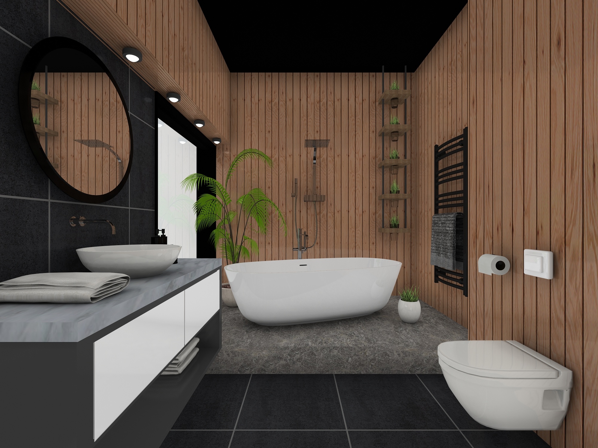 a modern and stylish bathroom design with a focus on tactile textures and clean lines the room features beige ceramic on the walls giving it a warm and natural feel the floor is covered with dark tiles contrasting with the light wood and adding depth to the space the bathroom includes a freestanding white bathtub placed on a stone like surface on the left there is a sleek contemporary vanity with a large round mirror above it the vanity is topped with a marble like surface and a small decorative plant with neatly folded towels below a modern faucet is mounted on the wall and beside the sink is a shelving unit with small plants adding a touch of greenery to the room on the right side of the image there is a chrome heated towel rail and the wall next to it features a toilet and a toilet paper holder both in minimalist white the room is illuminated by recessed lighting along the ceiling contributing to the clean modern aesthetic of the space the overall design is sleek sophisticated and calming with a blend of natural wood dark tones and minimalist fixtures architecture