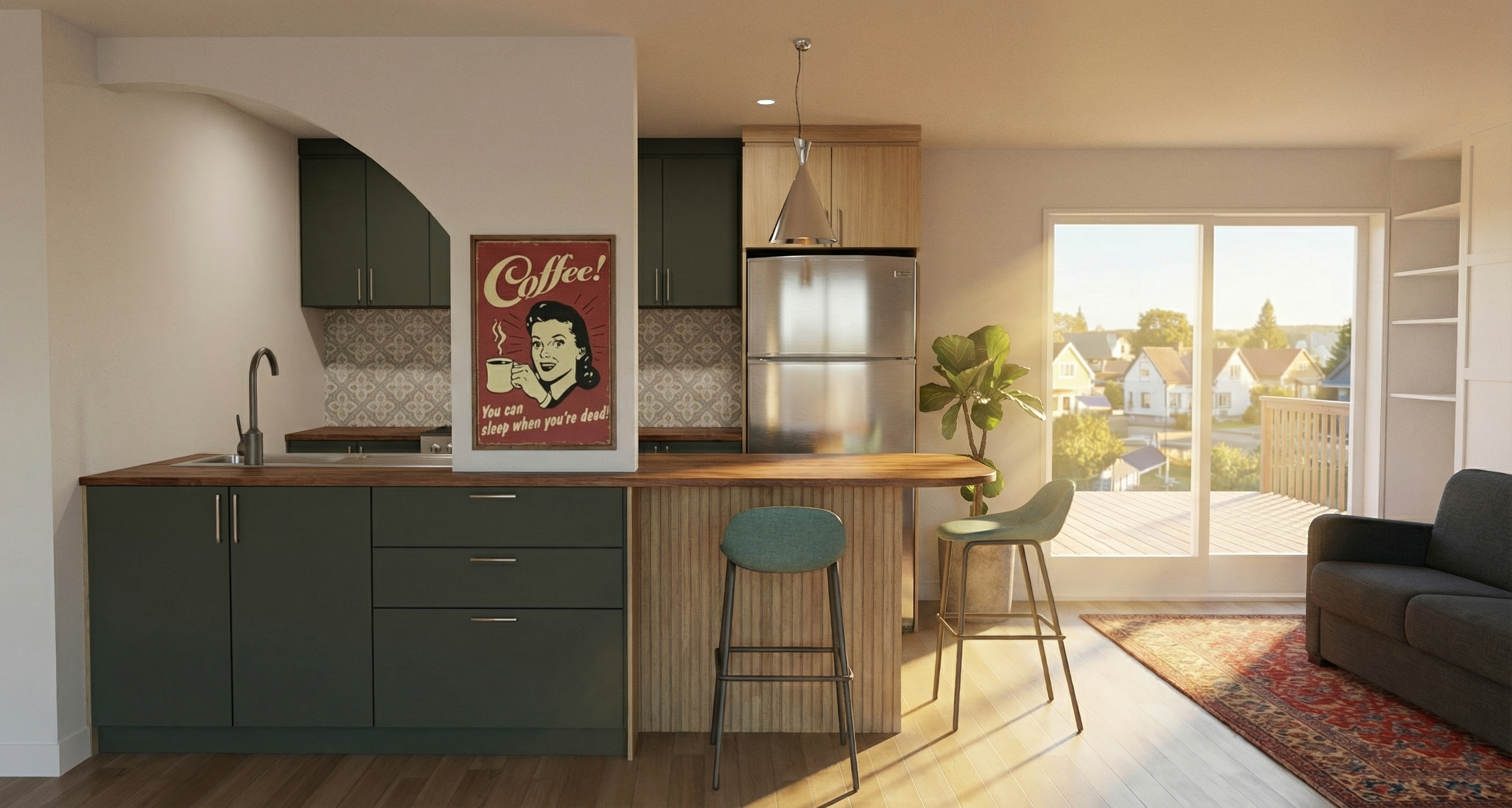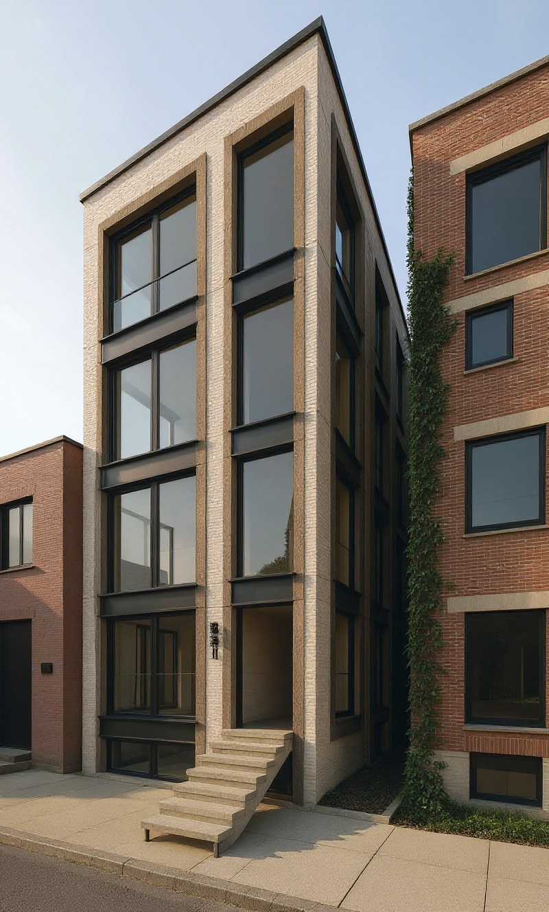 render this building metal window framing cream brick color at front add some green between buildings change horizontal floor mullion black metal use similar strategy as previous rendering left and right building should be red brick