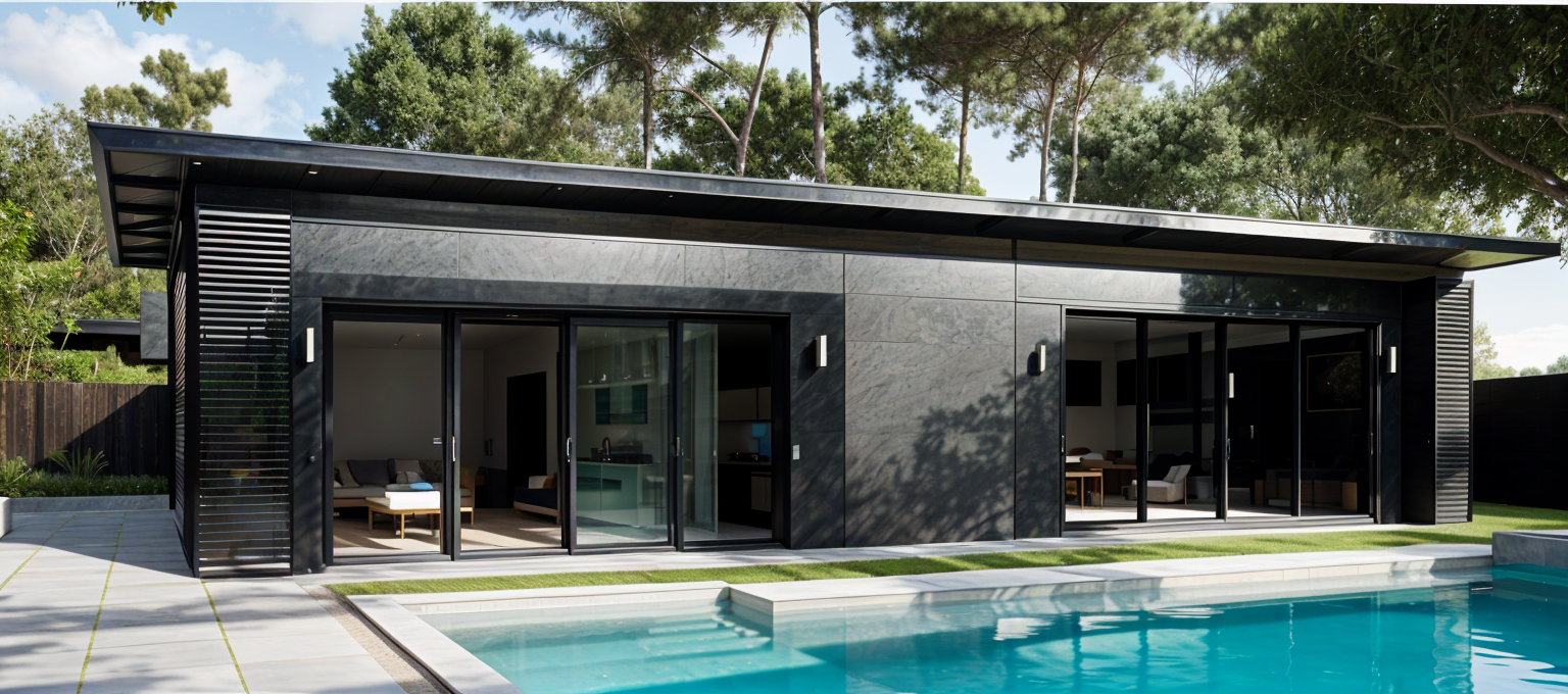 modern coastal outdoor living space featuring a spacious patio with wooden deck comfortable seating a stone fireplace and a jacuzzi surrounded by lush greenery and beach inspired decor soft lighting and ocean blue accents