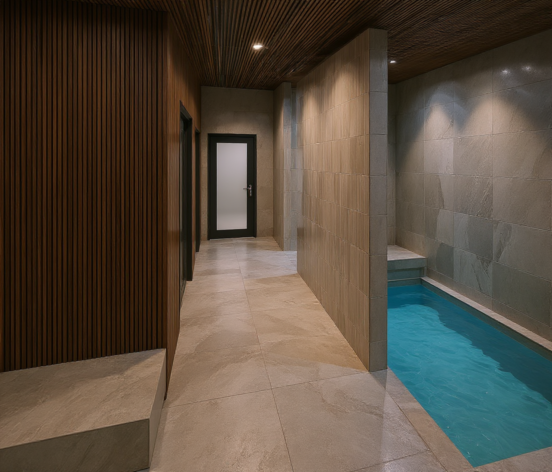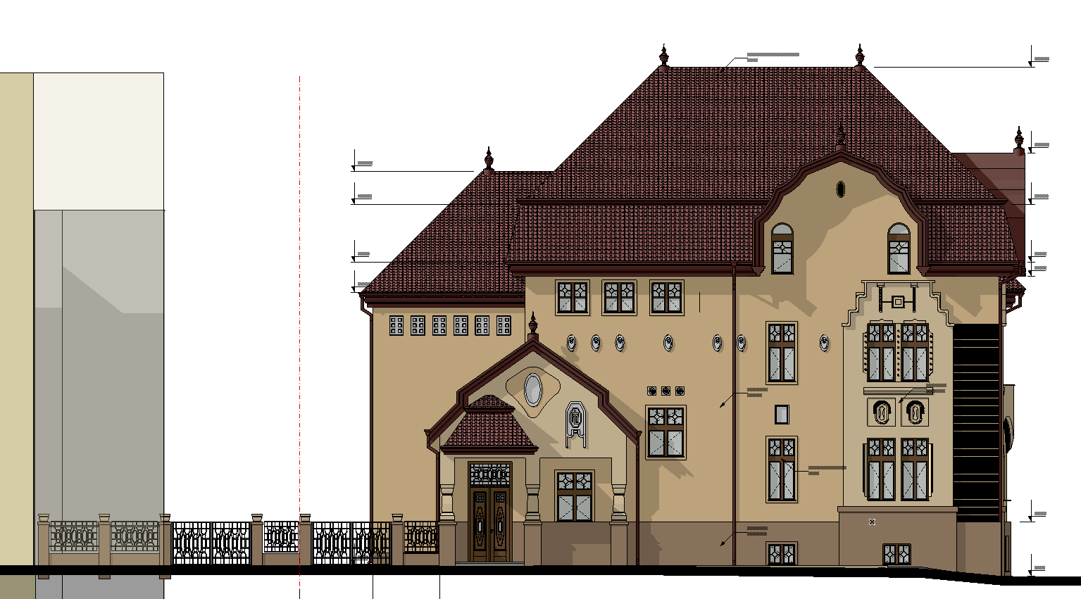 sunny day trees in the background dark brick color roof with modern flat scale tiles white fassade cinemativ hyperrealistic render