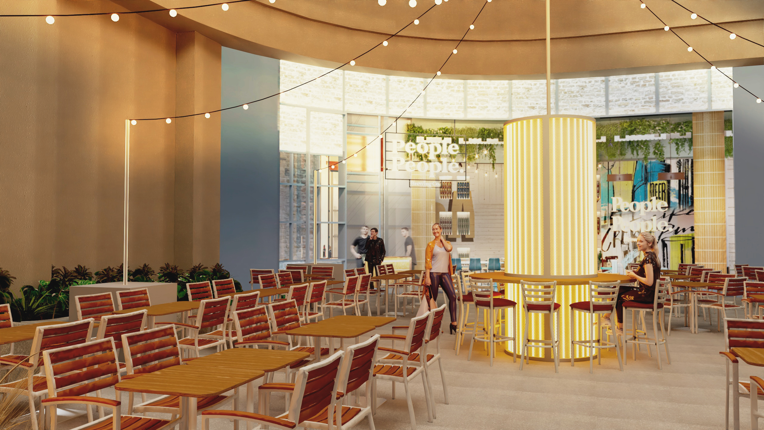 change to night view with exciting lighting setting for a beer garden with red and green neon light add more people drinking beers add naturalistic lighting effect from ceiling add coloured lighting effect on facade walls to enhance the thrilling mood