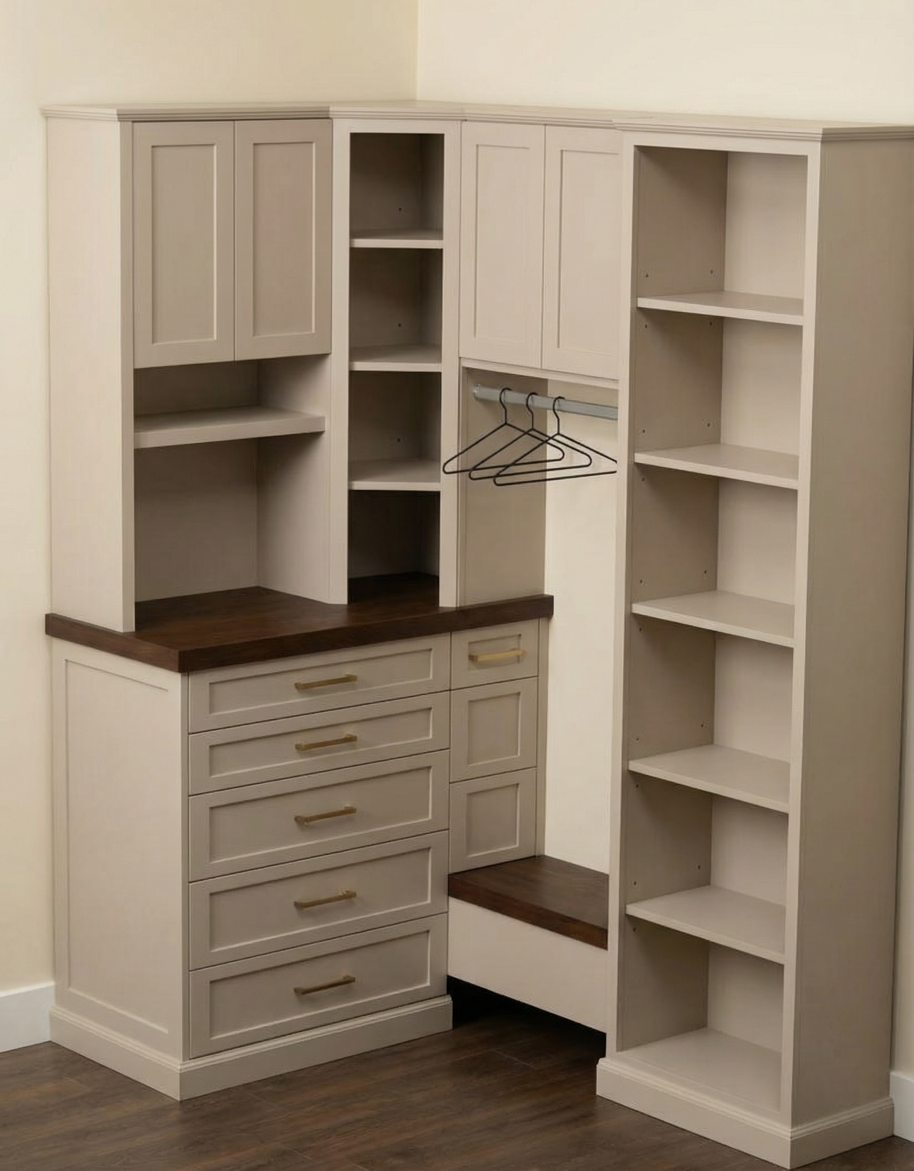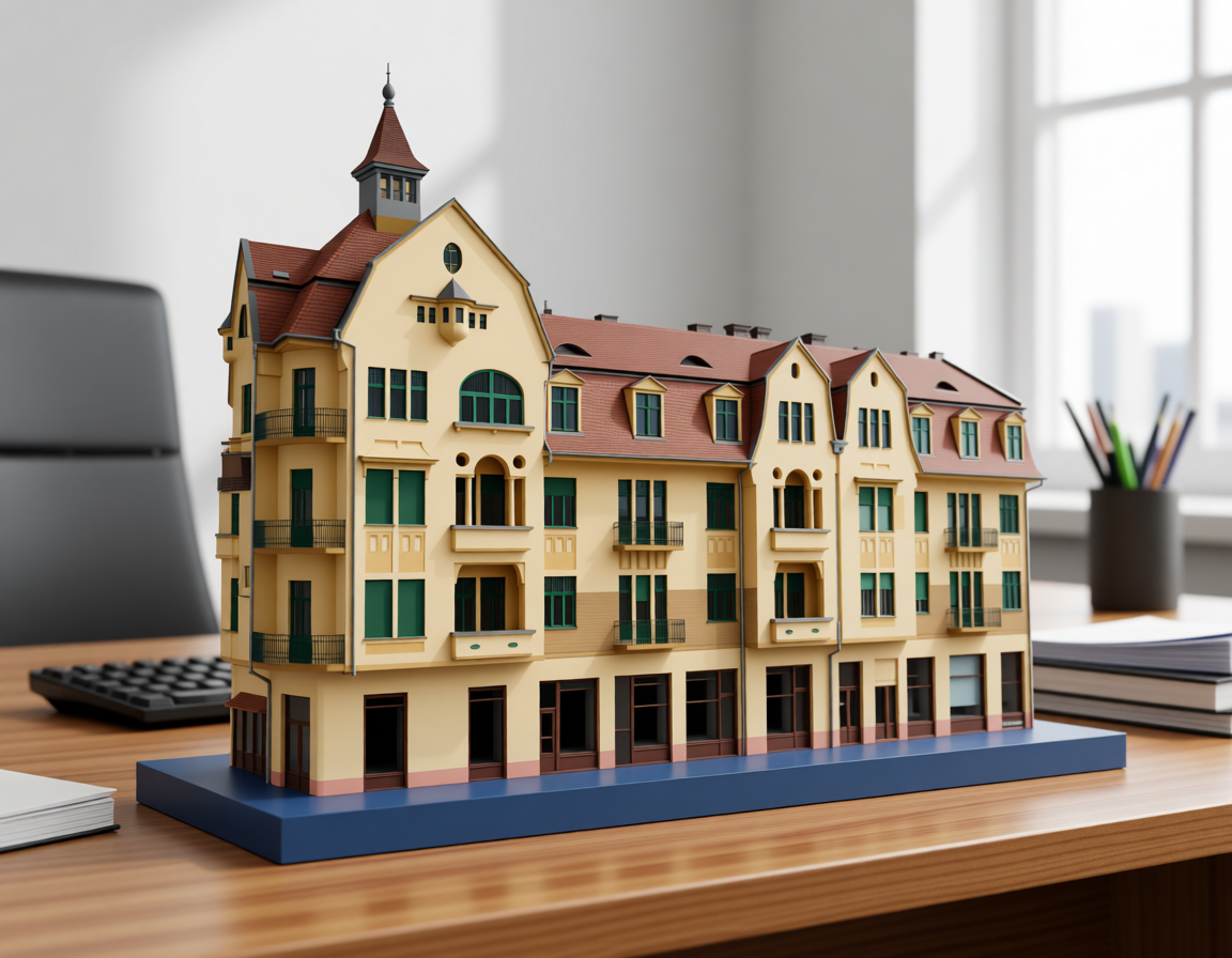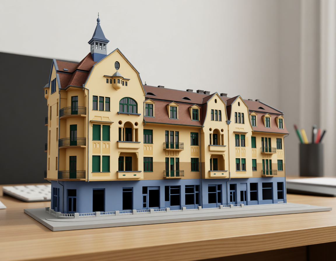 create a 2 color 3d printed model on an office desk using white for the facade and gray for the roof and for the windows and door frames