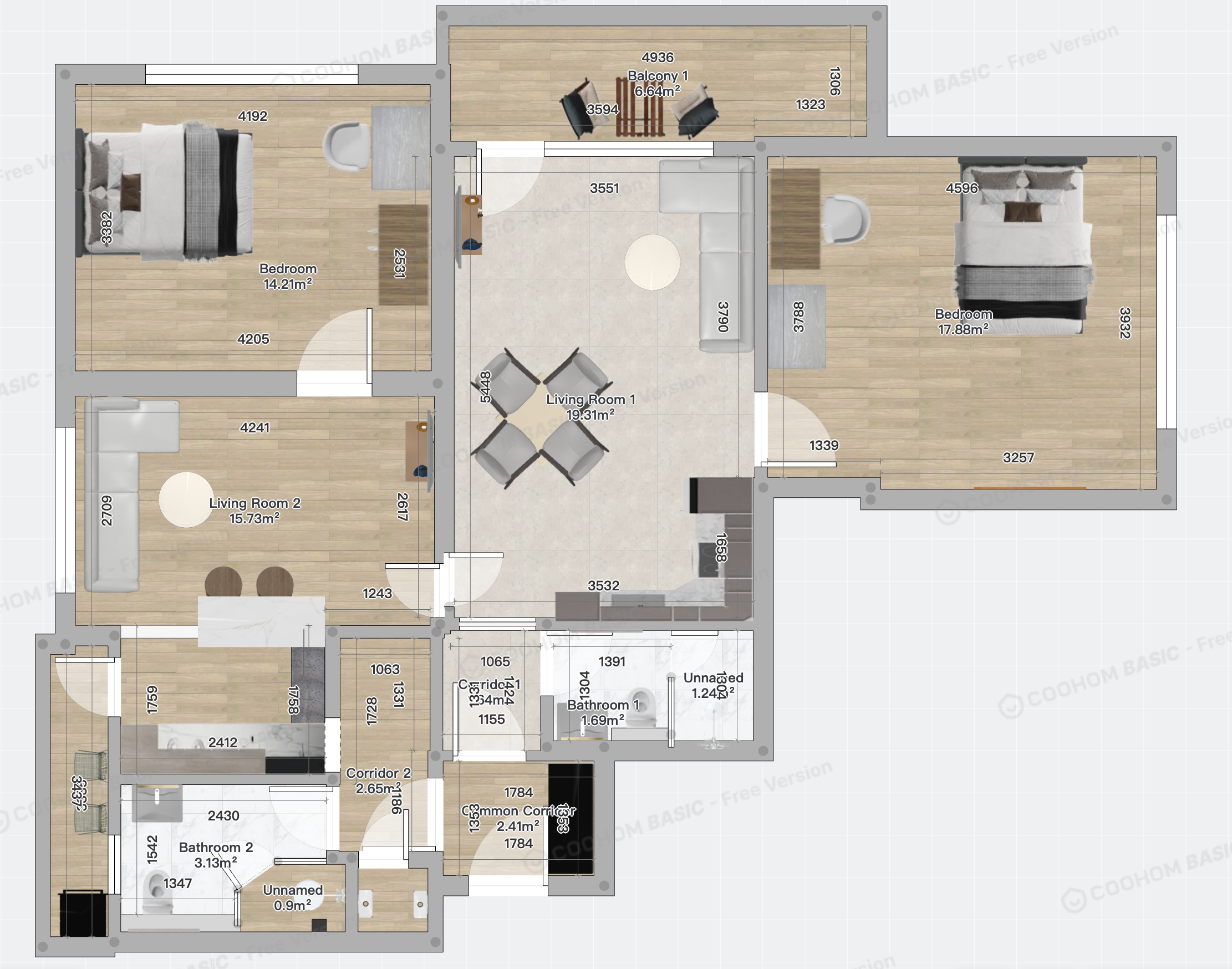 convert this floor plan into a realistic isometric 3d view of a full house show the space from an elevated angle with furniture walls and details visible create a detailed and luxurious 3d rendering of a modern apartment floor plan use warm inviting colors throughout soft beige and cream for the walls natural oak wood for the floors and elegant mint green and terracotta for the bathrooms and kitchen surfaces furnish the rooms with mid century contemporary furniture minimalist design incorporate lush greenery through indoor plants to add freshness the lighting should be ambient and cozy with warm toned led lights highlighting key areas like the living room and dining area the overall atmosphere should be tranquil sophisticated and welcoming use the same furniture as shows on the plan do not change the orientation of the floorplan