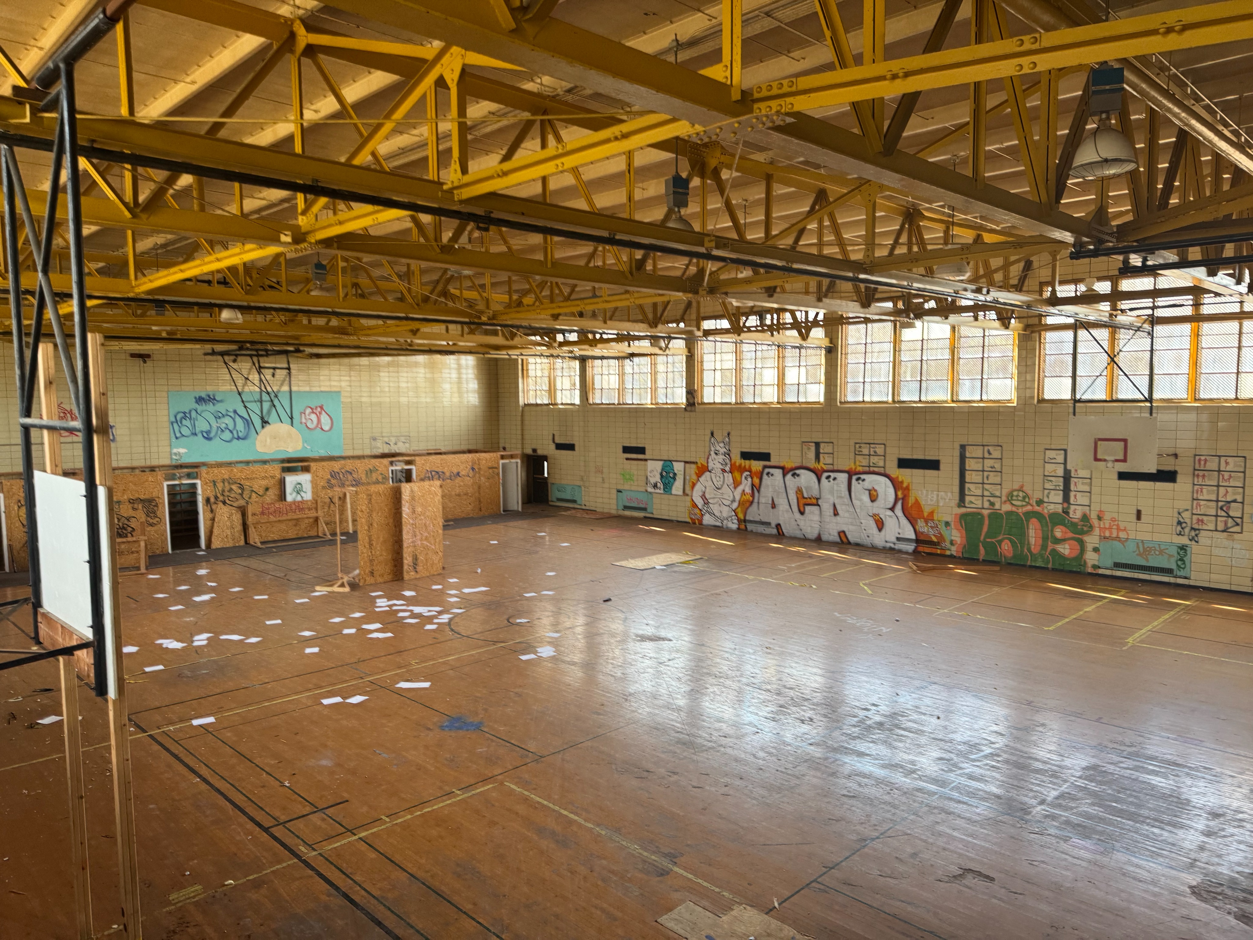 turn this into a vibrant renovated space where all of the grafitti has been removed make it a watercolor style
