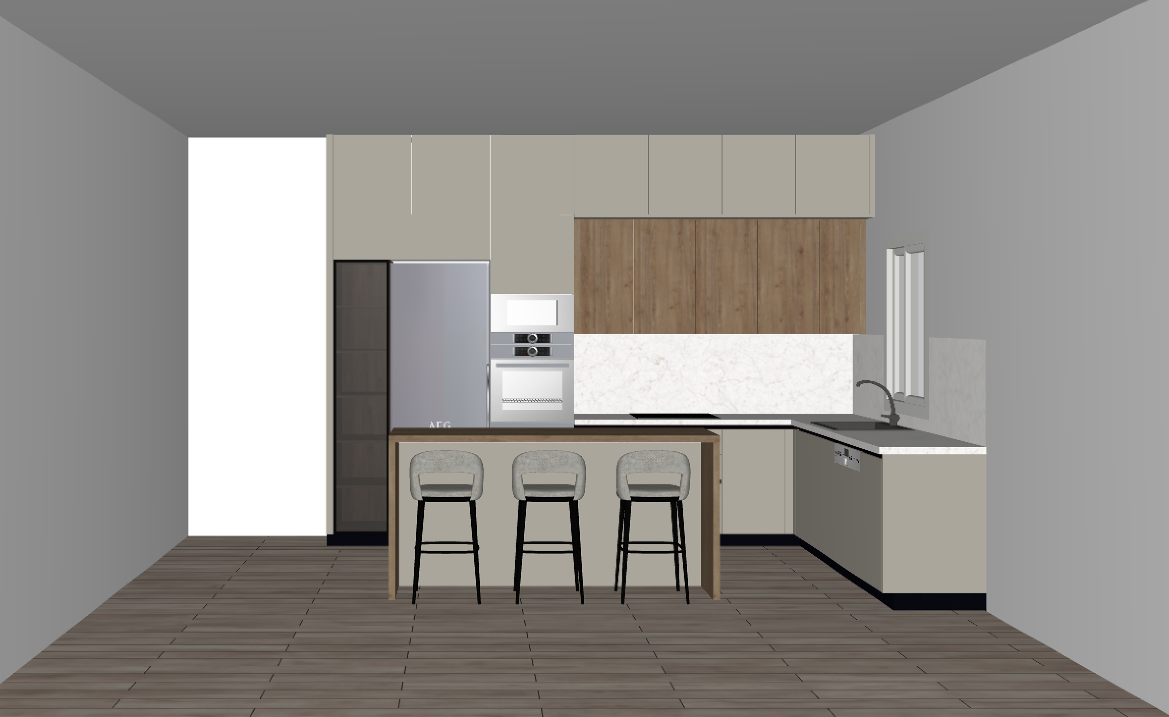 a modern kitchen with a clean minimalist design cabinetry is a soft taupe contrasted with upper cabinets in a rich walnut wood the backsplash and countertops are a sleek white marble with subtle gray veins the kitchen island features a walnut wood finish topped with the same marble stainless steel appliances are seamlessly integrated including a refrigerator and microwave bar stools are upholstered in a light gray fabric with black metal legs the flooring is a warm gray brown wood walls are a soft dove gray and the space is illuminated with natural light for a bright airy atmosphere