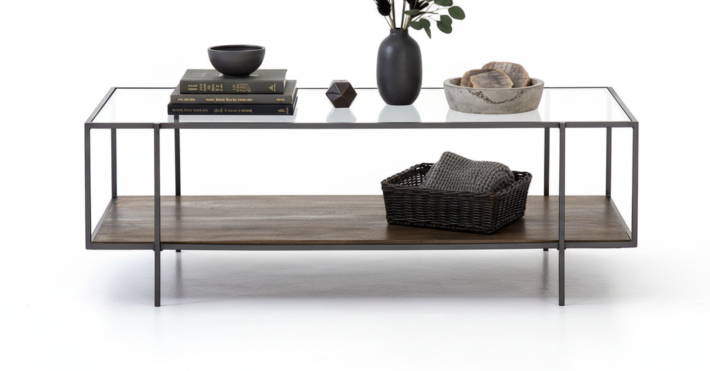 style this coffee table with books a vase a cute bowl and any other styling items you choose in a slightly masculine way with the vibe of west elm or cb2 remove the background but not the glass top put a stack of books on the bottom wood shelf and a folded blanket but an open magazine a cup of coffee and a pair of glasses on the top glass shelf