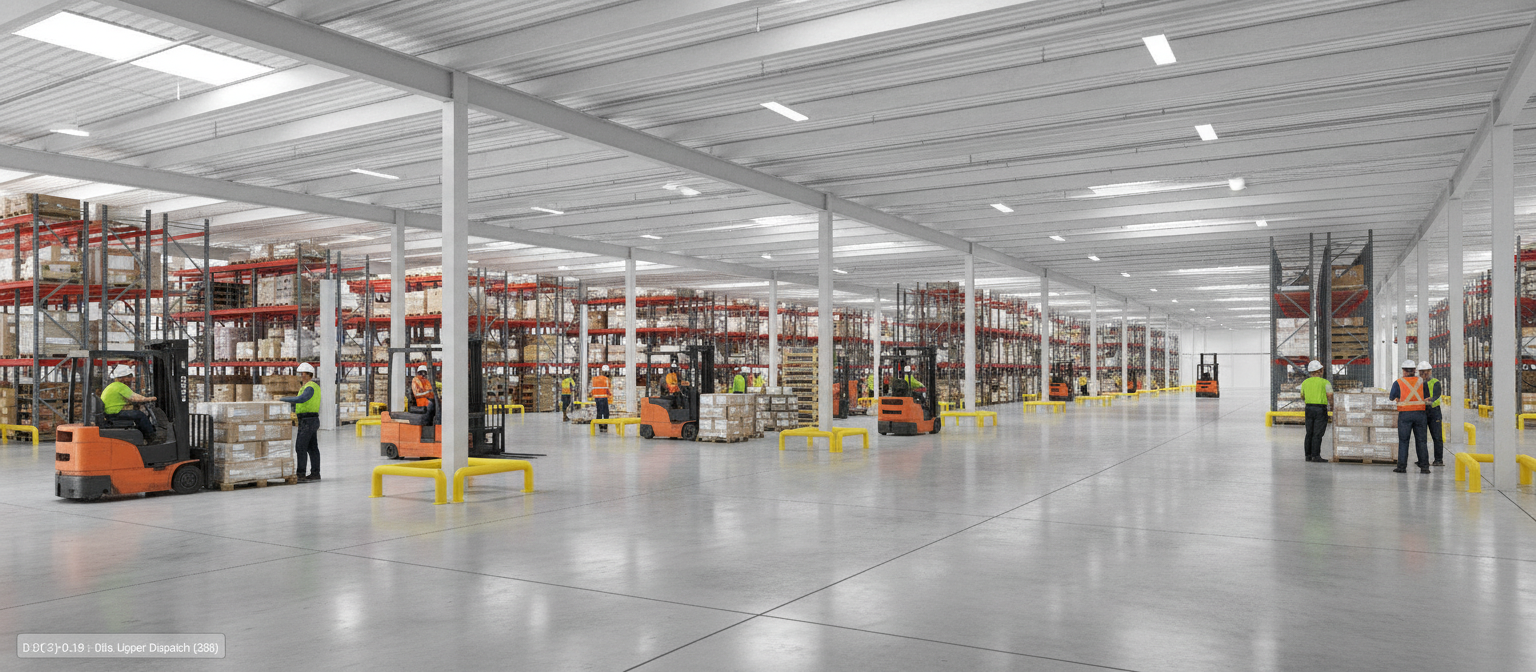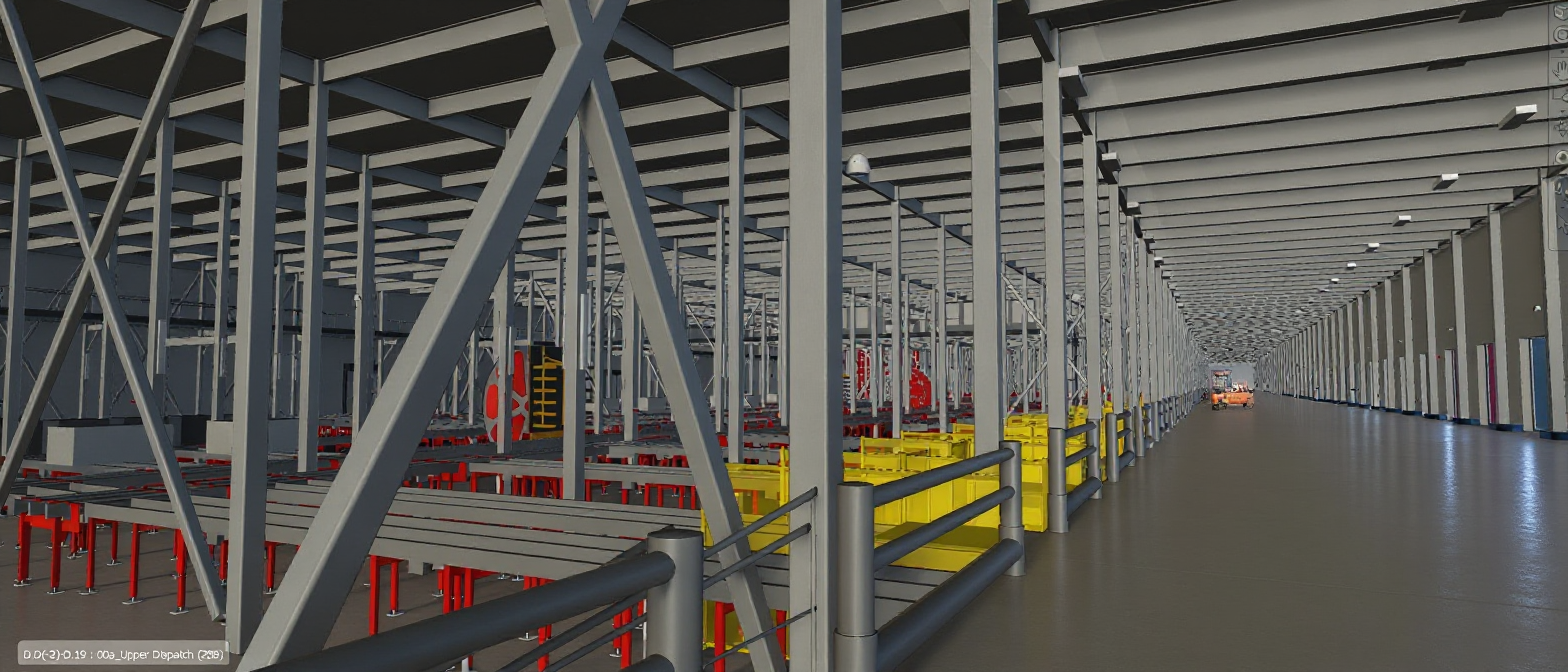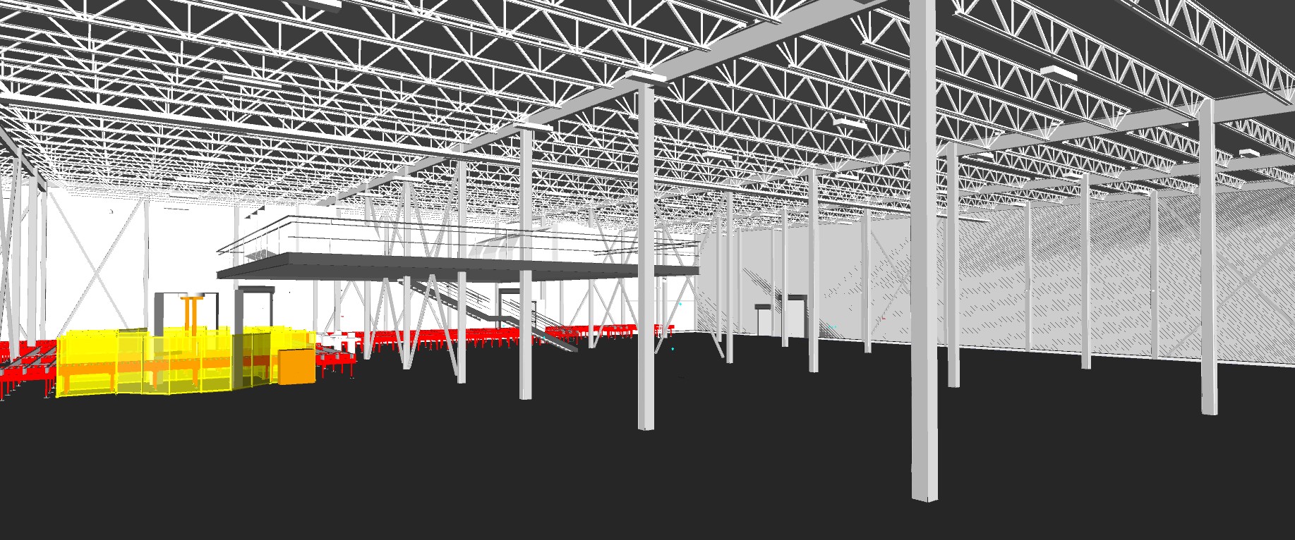 interior rendering of an industrial mezzanine seald concrte floors white roof decking gray structural steel automation equipment and palle tjacks and industrial workers and pallets of frozen food