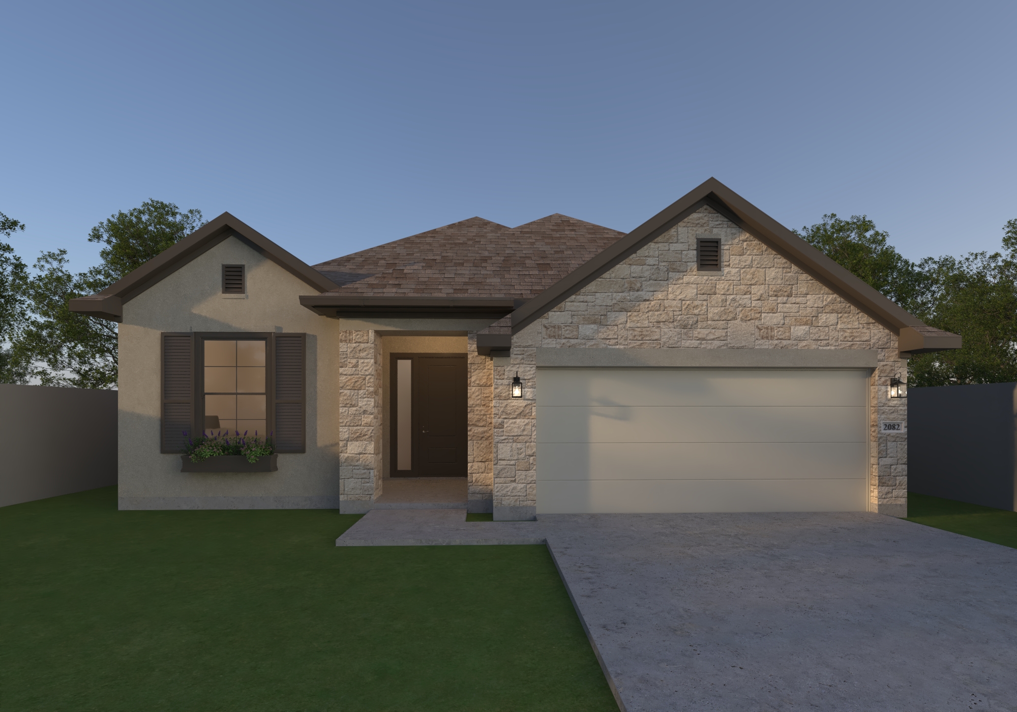 photorealistic exterior render of a central texas home in early evening the sky should have a soft gradient with soft blue overhead and a warm fading glow near the horizon lighting should feel cinematic and natural with residual low angle sunlight combined with cool ambient sky light maintain contrast between warm and cool tones warm highlights on the home and cool soft shadows in the environment avoid flat or evenly lit conditions introduce soft dappled tree shadows across the front yard driveway and portions of the facade as if cast by trees located off camera shadows should still be clearly visible but slightly softened compared to full daylight helping shape the scene without overpowering it maintain full architectural accuracy of the home do not alter structure or proportions enhance all stacked stone and masonry surfaces to appear highly realistic and dimensional catching warm grazing light on edges while allowing deeper shadow in recessed areas windows should emit a warm interior glow suggesting occupied space interior lighting should feel soft and inviting with gentle falloff and no overexposure glass should retain subtle reflections of the sky and surroundings exterior light fixtures garage light entry light should be on casting warm localized pools of light onto the stone and adjacent surfaces with realistic falloff and no harsh hotspots include a vertical cedar privacy fence extending from both sides of the house into the backyard with a natural warm wood tone fence should remain visible but slightly subdued in lower light use an architectural garden approach low groundcover and ornamental grasses in the front layer medium shrubs in the middle layer integrate layered flowering plants that remain visible and contribute color even in dusk lighting use soft natural blooms white light yellow soft purple muted pink that catch subtle highlights and add depth flowers should be present and noticeable not lost in shadow edges of planting beds should remain clean and intentional with subtle contrast between mulch planting and lawn even under lower light conditions in the background include a small number of mid ground trees behind the fence and a soft distant tree line for depth trees should remain subtle and non dominant terrain should remain flat add subtle real world imperfections slight discoloration near the base of walls mild material variation and gentle wear avoid overly clean or artificial finishes camera should feel like a real architectural photograph natural perspective slight lens softness and balanced exposure overall mood should feel warm calm and high end a realistic early evening residential scene with a balance of natural light soft shadows and inviting interior glow