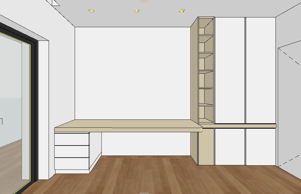 create a render in hyper realistic architectural visualization quality add a desk chair and decor on the desk for a young man beige colour is light wood and white is laquered white wood add a desk lamp and laptop