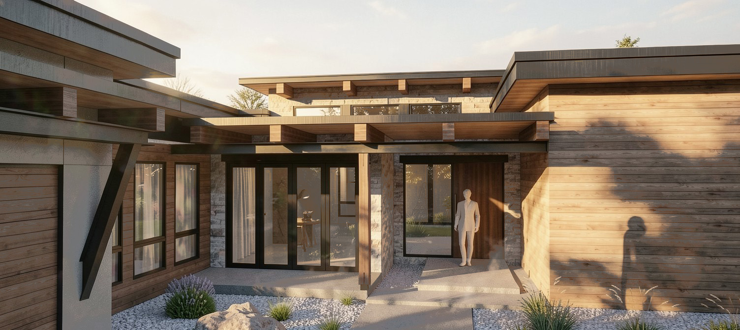 a modern stylish house with a sleek design showcasing wooden exteriors with a natural light brown hue the structure is accented with dark matte black metal beams large glass windows invite soft warm sunlight creating a welcoming atmosphere the landscaping features small rocks in pale gray and lush green plants for contrast the sky is clear with an early evening golden glow enhancing the setting