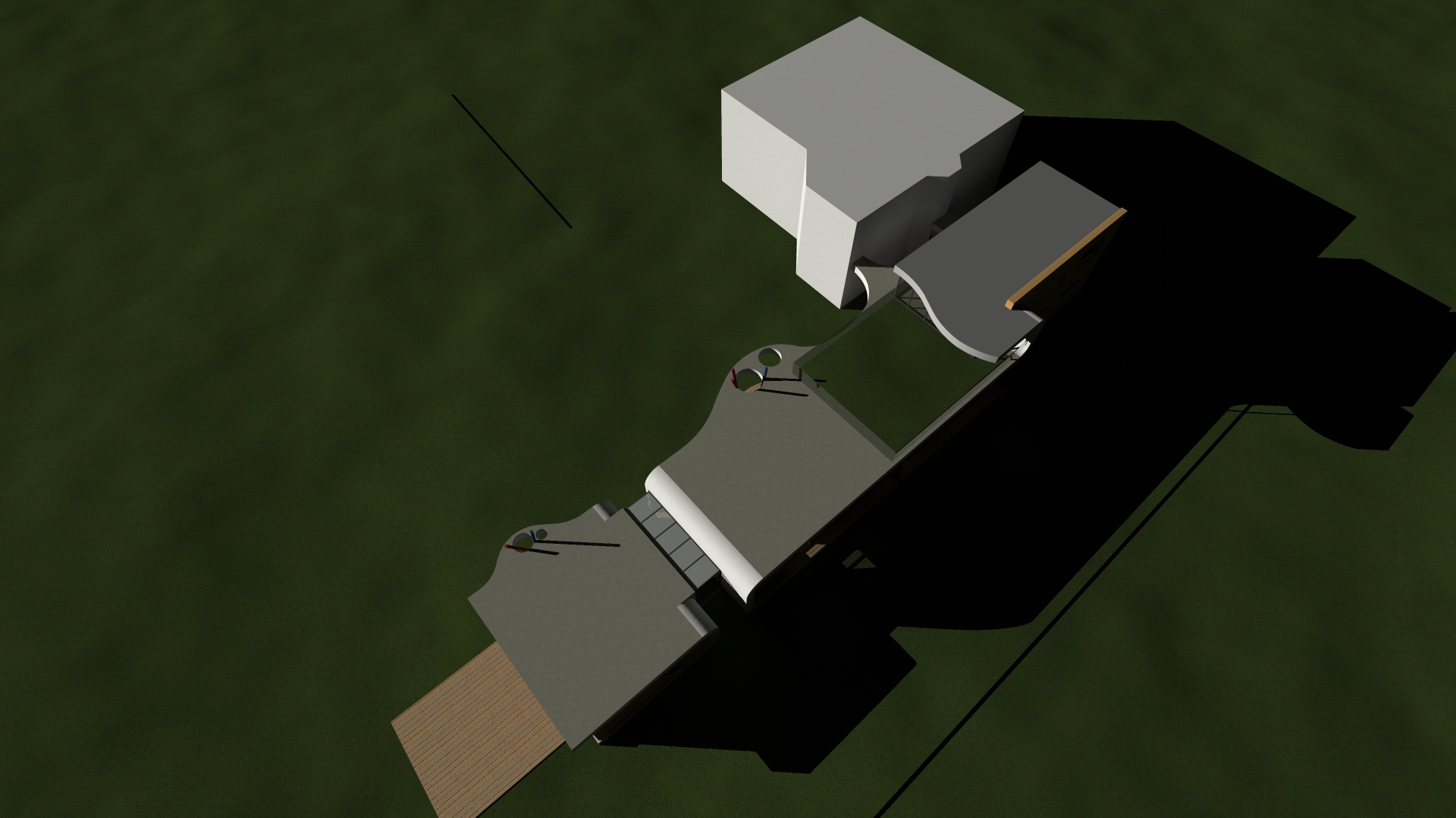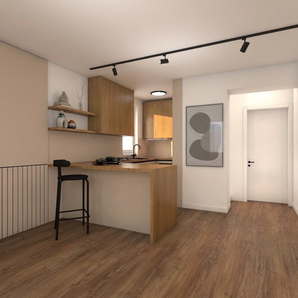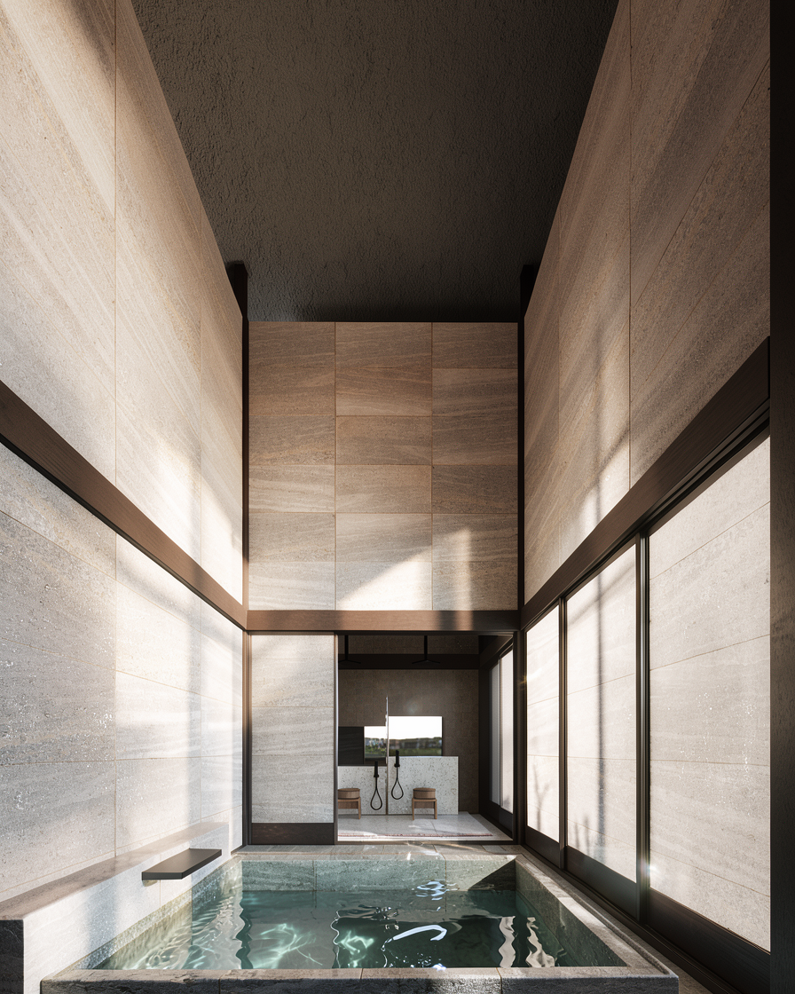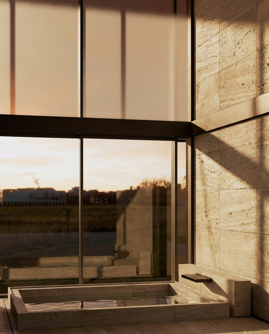 convert the image into a realistic outdoor photograph with professional architectural aesthetic maintaining 100 of the geometry and layout applying authentic materials afternoon warm lighting with soft shadows and a sharp photorealistic result use real images of people instead of the ones in the original image add landscape design behind the building do not change material colors