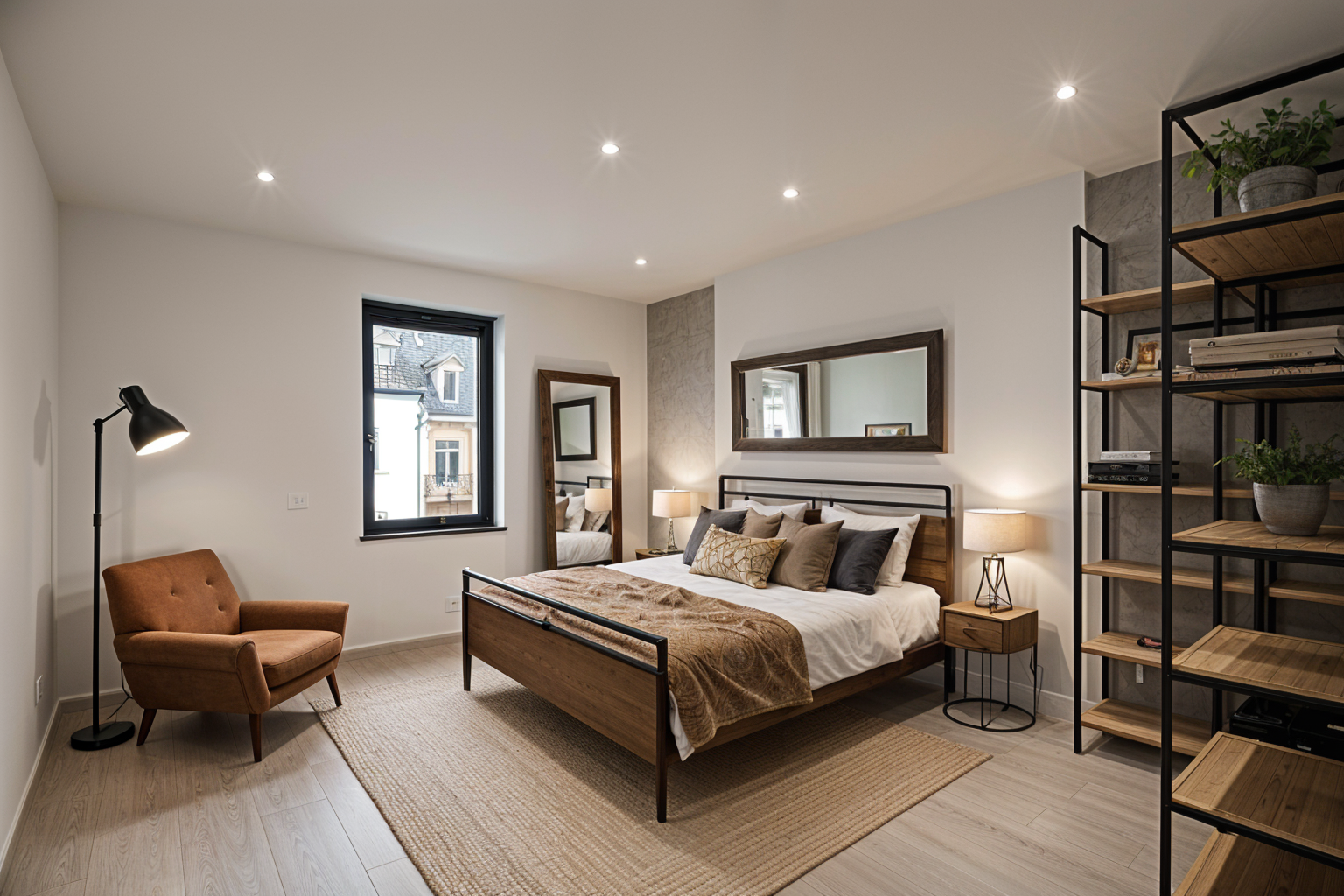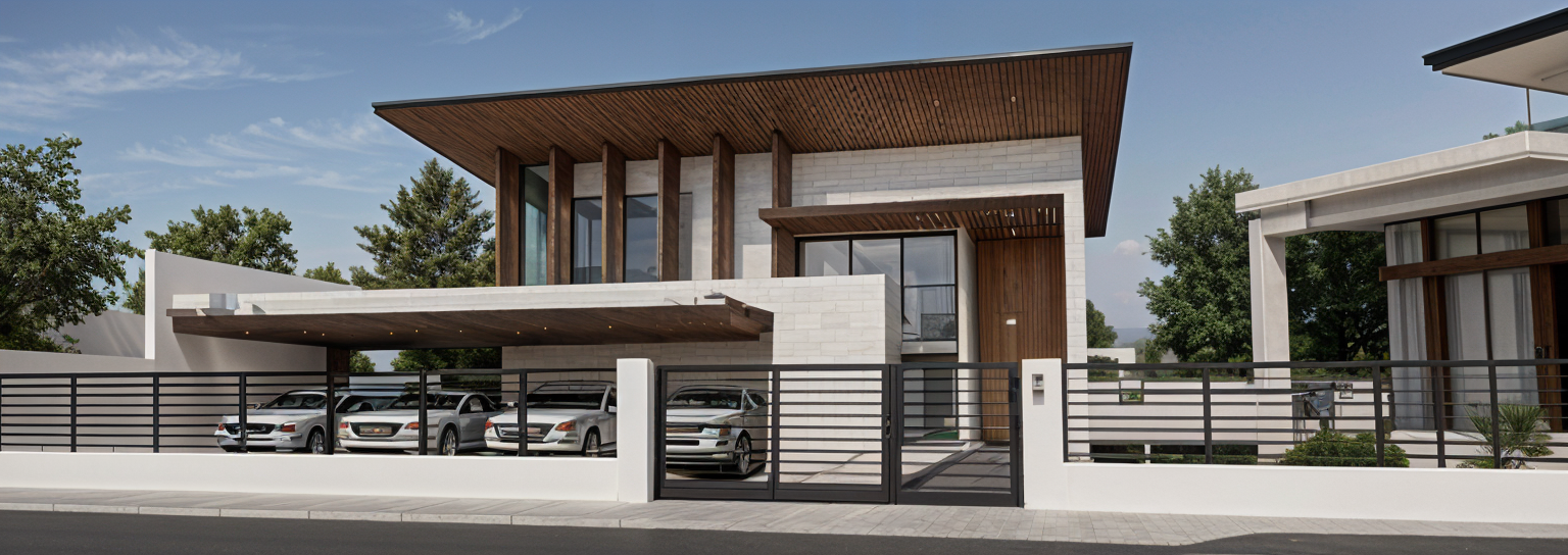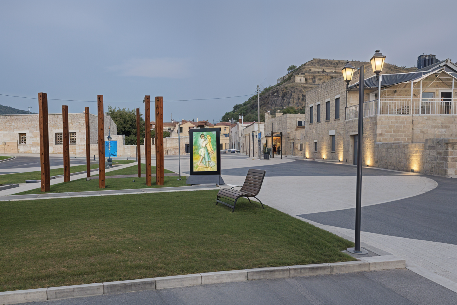high tech exterior shot evening soft lighting old ruin city with yellow led lamps on the ground turistic info and benches on grass corten steel bars architecture