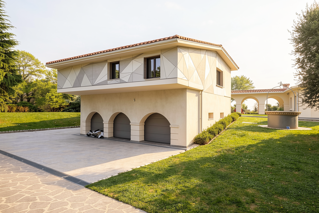 enhance this image for client presentation it should look photo realistic it is a high end country home ion an exclusive lake in quebec it should look luxe and rich and materials should have quality and depth do not change architecture at all