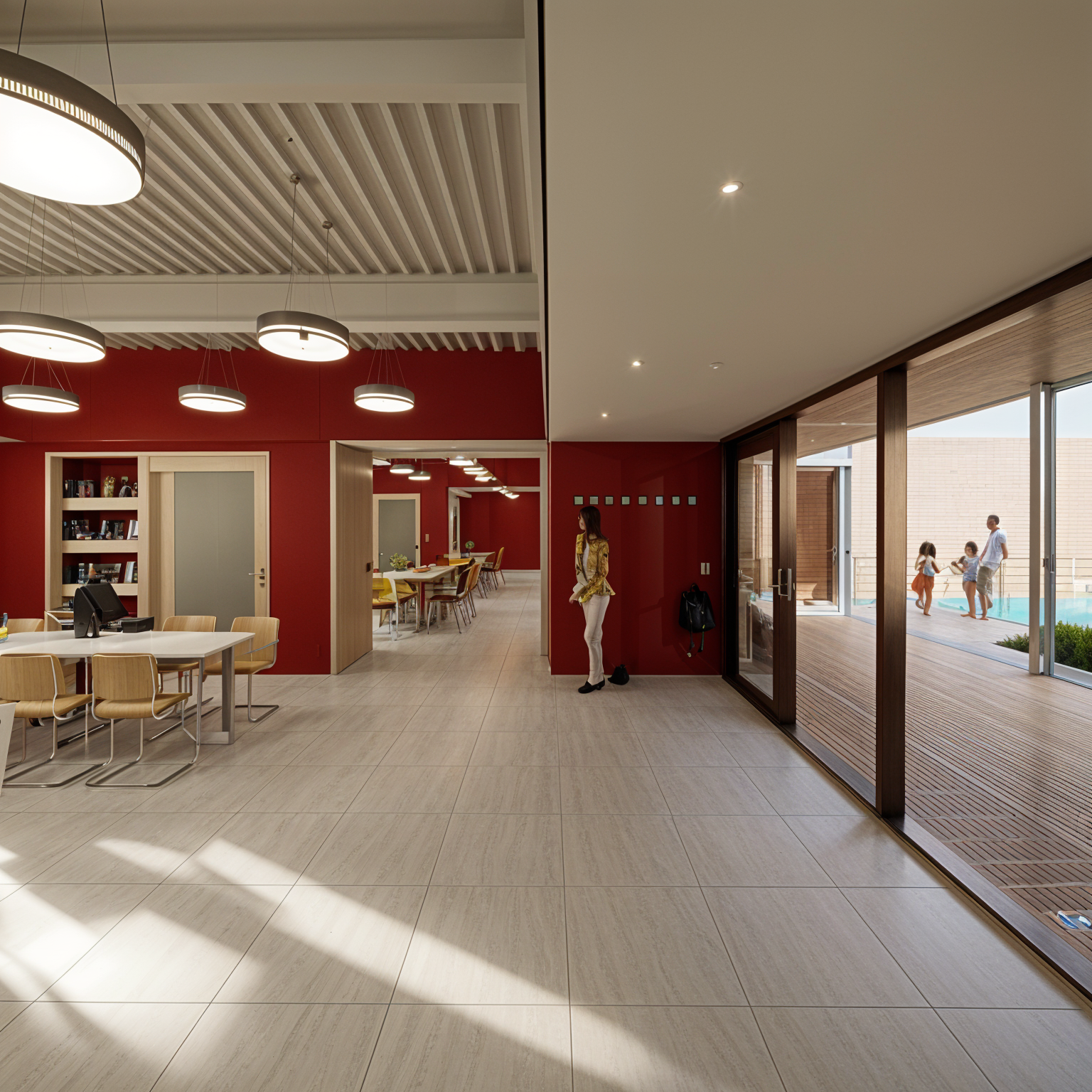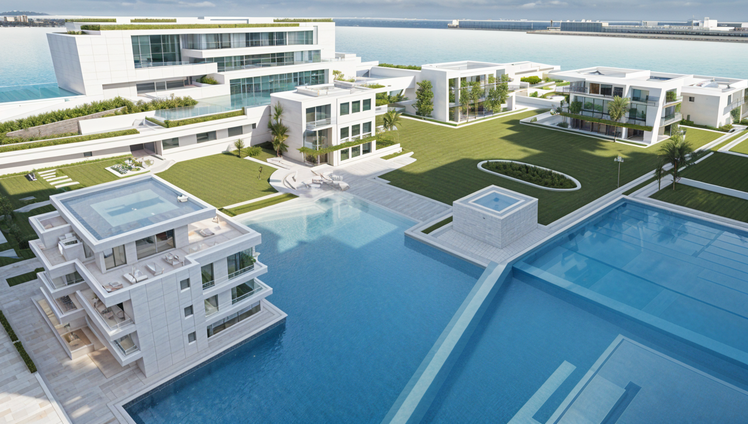 zaha hadid exterior shot render a modern apartment complex surrounded by lush greenery the buildings are sleek and minimalist painted in a pristine white with large glass windows reflecting the sunlight the railings and balconies exhibit a sophisticated matte black the outdoor landscape features a tranquil pond with crystal clear blue water and green grass the atmosphere is serene and inviting with a clear sky enhancing the peaceful ambiance architecture