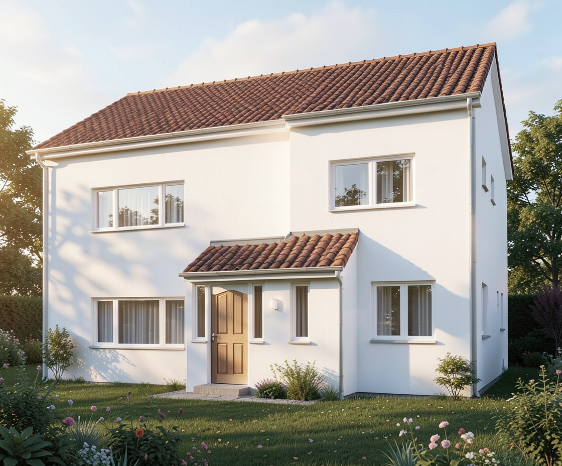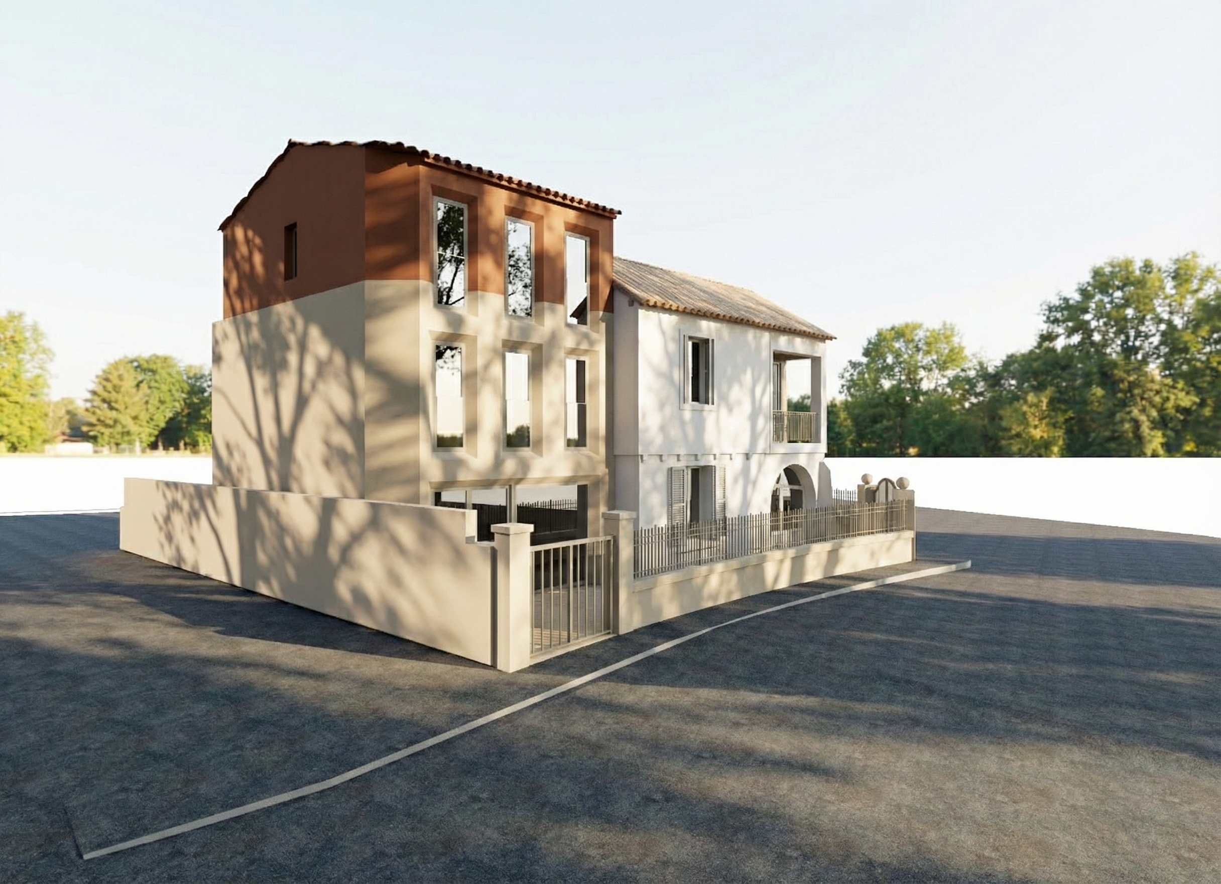 make as photorealistic as possible while keeping textures the same as selection professional landscaping in a lightly wooded scene with good lighting off white brick brown roof tan windows tan stucco