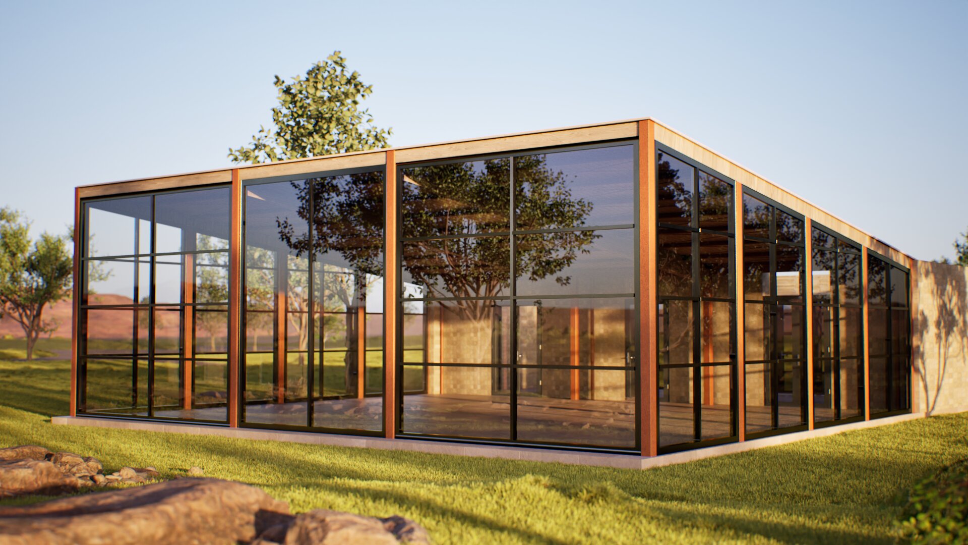 sostituisci solo il lato destro dell edificio con un muro rivestito da blocchetti di tufo grigio non modificare le altre cose ci che vedi in marrone corten