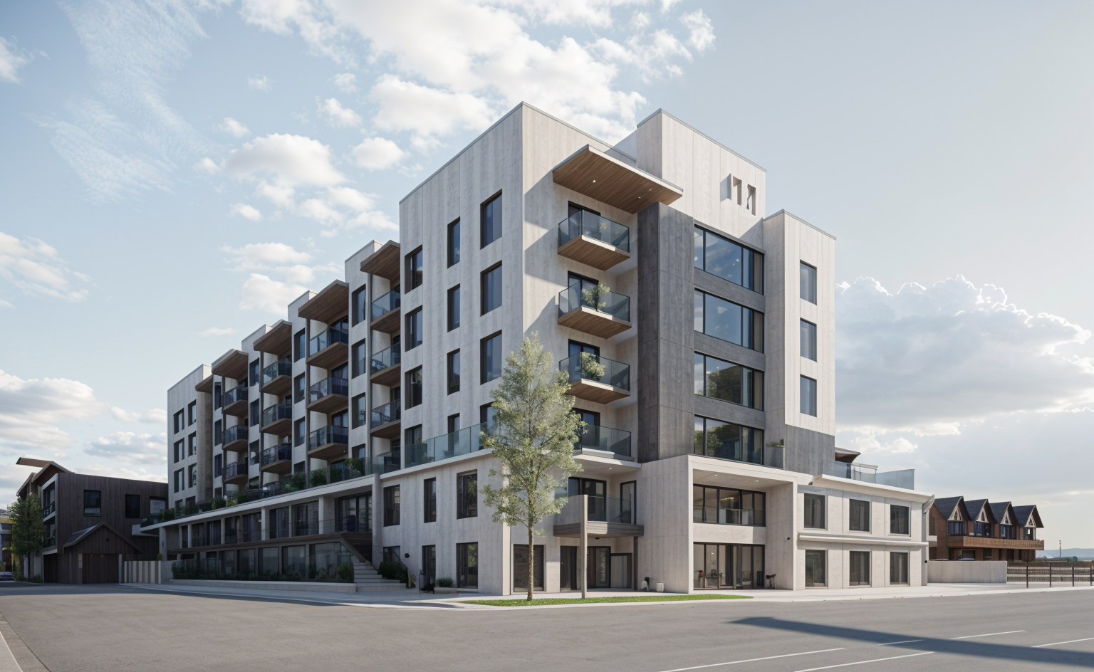 render this 6 storey multi family building in a farmhouse modern and west coast contemporary hybrid style allowing for subtle architectural refinement to enhance depth and visual rhythm while preserving the overall massing and proportions avoid a bright or predominantly white palette instead use a rich balanced mix of darker and mid tone materials that evoke warmth and regional character use deep charcoal graphite and warm taupe fiber cement or metal panels as the primary fa ade materials complemented by natural wood accents in cedar or hemlock tones around balconies soffits or key vertical sections introduce limited use of light neutral panels warm grey or sand tone only as secondary contrast to break up large surfaces maintain vertical and horizontal differentiation through tone and texture rather than stark colour shifts integrate black or dark bronze window frames clean reveals and restrained trim for a crisp modern edge allow minor fa ade variations such as recessed balconies parapet height changes or projecting vertical bays for rhythm and authenticity ground the lower storeys with durable tactile materials like stone veneer or textured concrete to anchor the massing lighting should be soft natural daylight that accentuates material richness depth and the interplay of dark and warm tones the overall impression should be modern regionally grounded and timeless combining the cozy authenticity of farmhouse modern with the sophistication and material refinement of west coast contemporary architecture