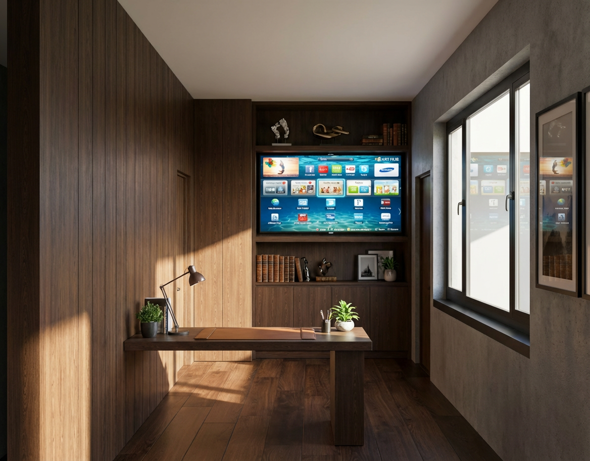 render a luxurious modern interior with large floor to ceiling windows the walls are a soft beige wood providing a warm and inviting atmosphere the floor is a polished concrete in a slate gray reflecting subtle light accent elements like the window frames are a sleek matte black to add contrast the ambiance is bathed in natural light with soft shadows creating an airy and spacious feel marble skirting in a white with subtle gray veining adds an elegant touch the overall atmosphere is tranquil and refined with a minimalist yet sophisticated design approach the windows overlook a golf club and the ceiling has beadboards