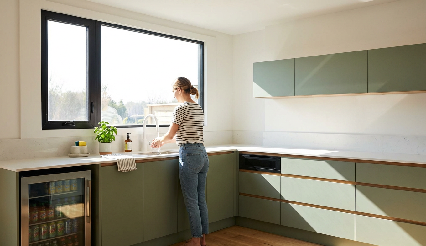 photorealistic enhancement of the provided architectural render preserve the exact architecture layout materials furniture placement and fixtures from the original image with no redesign or modifications the purpose is only to improve realism and lighting quality render as high end interior photography using a full frame camera with a 24 35mm architectural lens balanced exposure realistic dynamic range subtle depth of field and natural color grading the image should look like a professionally photographed luxury interior rather than a computer render soft natural daylight diffused window light global illumination balanced exposure do not change architecture do not change materials no redesign no new objects no additional lights no glowing fixtures no light from shower heads or faucets no dramatic shadows no surreal lighting no warped geometry no stylization turn the chandelier light on