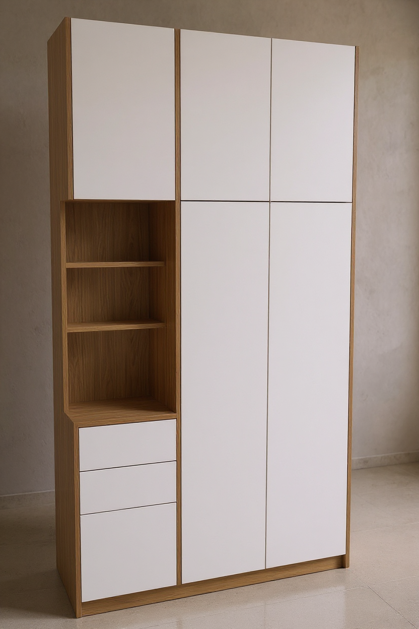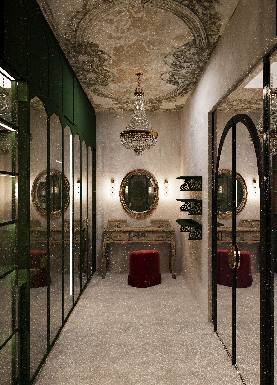 at the top there should be a nice cornice in the color from the picture this is a dressing room and inside there are warm led lights the doors are made of smoked glass and on the right side where you see it is the door to enter the dressing room which is mirrored put some decorative objects on the shelves and a bouquet of flowers on the makeup table