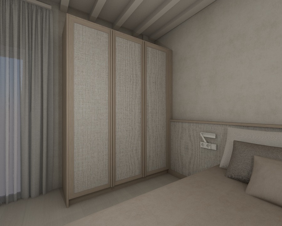 create a realistic and professional render of a bedroom with a calm and atmospheric mood the space is softly illuminated with daylight creating a gentle ambiance with the minimal shadows the lighting should feel balanced enhancing the realism of the materials the bed is dressed with linen sheets and a coverlet light in earthy tones the bedding palette includes broken white and beige linen fabrics while the coverlet is a beige linen tone adding subtle depth and contrast the fabrics look high quality refined and luxurious ultra realistic render high resolution professional interior design photography style keep the design exactly as it is the walls has a light beige tone like cemento effect light texture