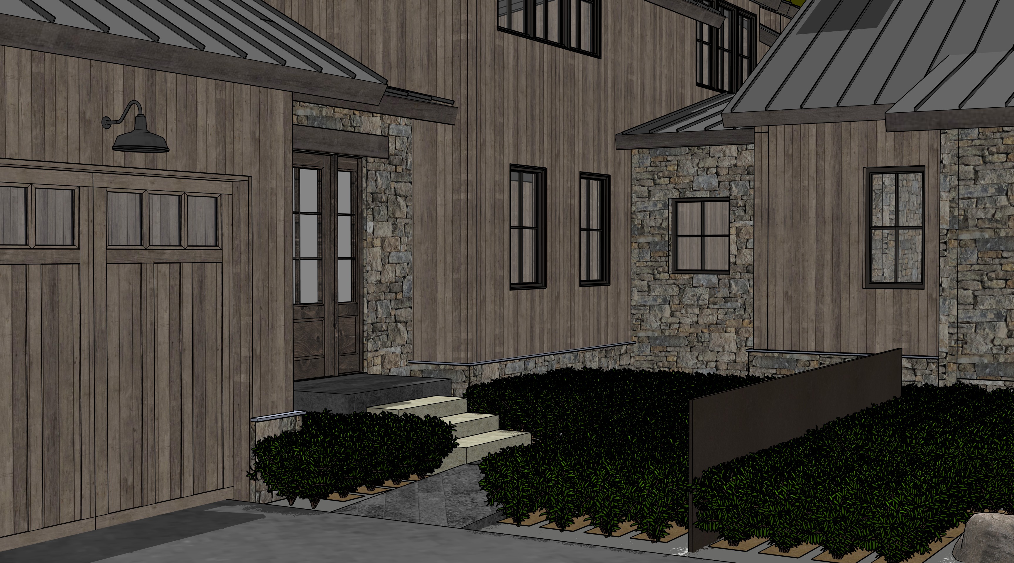 render a photorealistic 3d perspective of this house in jackson wyoming reference the current material style just enhance them charcoal standing seam metal roof vertical wood siding stone veneer walls keep model geometry the same windows doors roof walls cut stone walkway to front boardwalk landing where green fill in with lush vegetation around patio spaces that looks native to jackson wyoming asphalt driveway vertical steel charcoal colored panel in landscape do not change the view only enhance the current materials and make the landscape nicer vegetation detailed textures in the wood siding and glass reflections and a vibrant clear sky with light atmospheric depth render in hyper realistic architectural visualization quality 8k resolution
