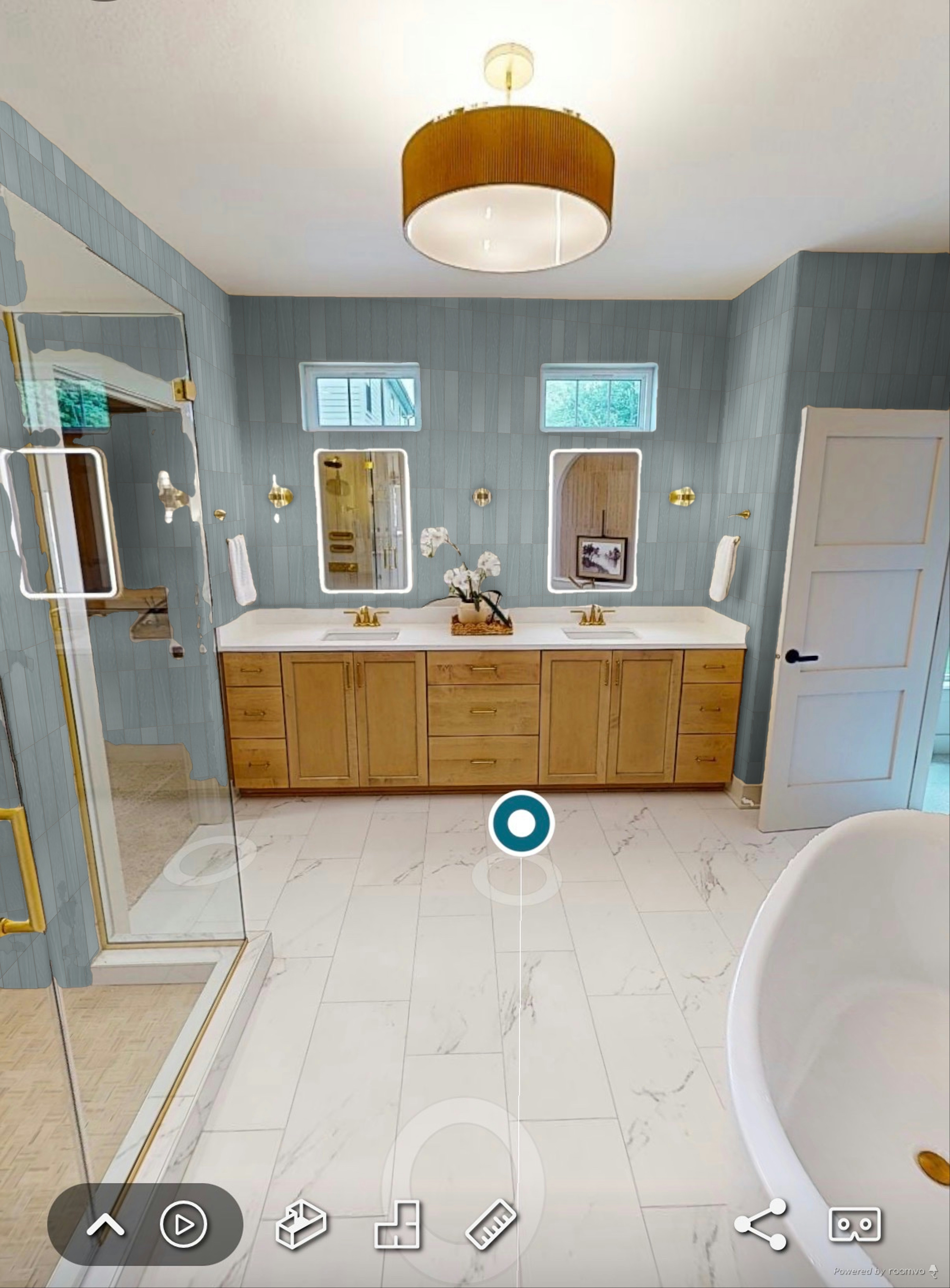 change floor to wide plank european white oak medium in tone change walls to shoji white except leave the backsplash wall behind the vanity the blue tile that is already there